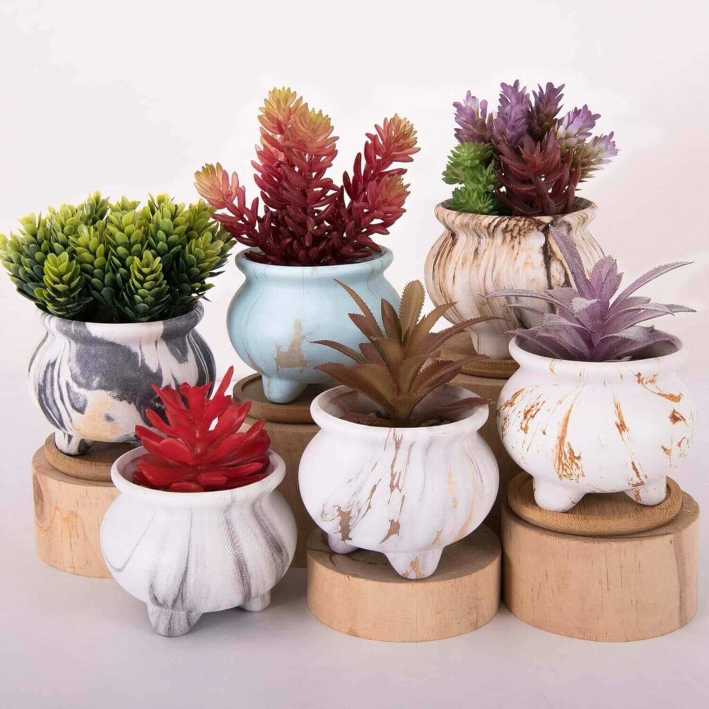 Create a chic indoor garden with this set of 6 marble ceramic succulent pots, complete with bamboo saucers and drainage holes. Customers love their stylish design, durable feel, and perfect size for succulents, cacti, or herbs. Ideal for desks, windowsills, or gifting, they add a modern, coordinated touch to any space.