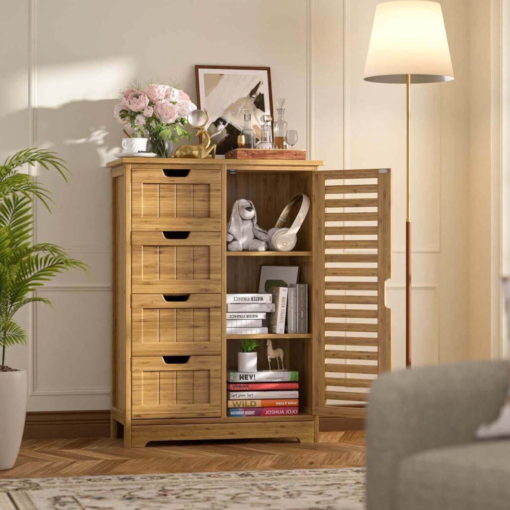 Maximize small spaces with the VIAGDO bamboo storage cabinet, featuring open shelves for display and a concealed compartment for hidden storage. Its sturdy, waterproof design makes it ideal for bathrooms, kitchens, or living areas while adding natural elegance. Reviewers note its easy assembly, durability, and compact versatility for organizing essentials in tight spaces.