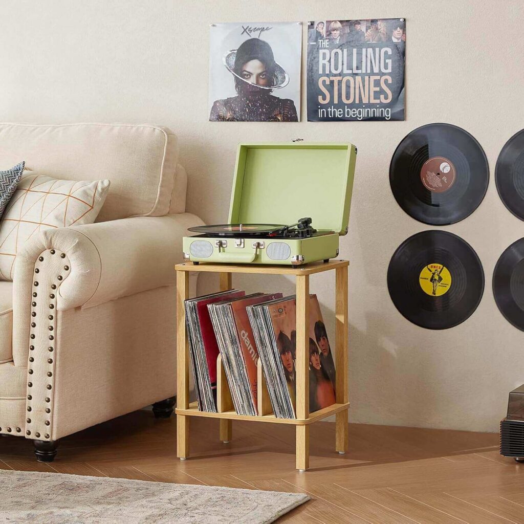 This 2-tier record player stand offers a spacious top for your turntable and a lower shelf that holds up to 100 records, keeping your collection organized. Crafted with solid wood pillars and adjustable feet, it stays stable on any floor, while rounded corners ensure safety and style. Its compact, sleek design also works as a side table or nightstand, perfect for small spaces and modern decor.