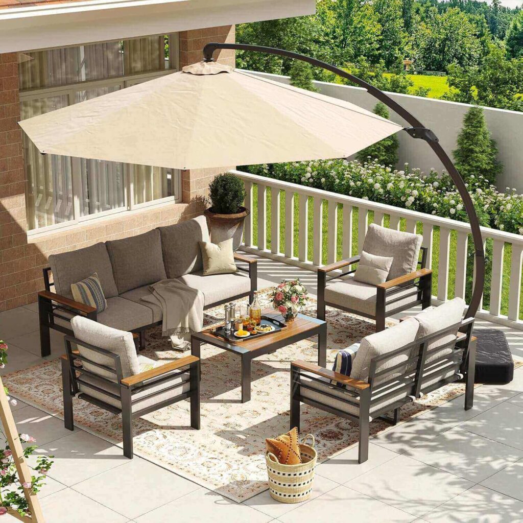 Elevate your outdoor gatherings with this 7-Piece Outdoor Patio Set with Umbrella. Featuring spacious seating for seven and a built-in umbrella for shade, it combines comfort, style, and durability. Thick cushions, ergonomic backrests, and a sturdy aluminum frame ensure long-lasting support and relaxation. Customers love its easy assembly, weather-resistant materials, and the versatile setup for patios, poolside, or gardens. Perfect for family meals, parties, or lounging, this set makes any outdoor space inviting and stylish.