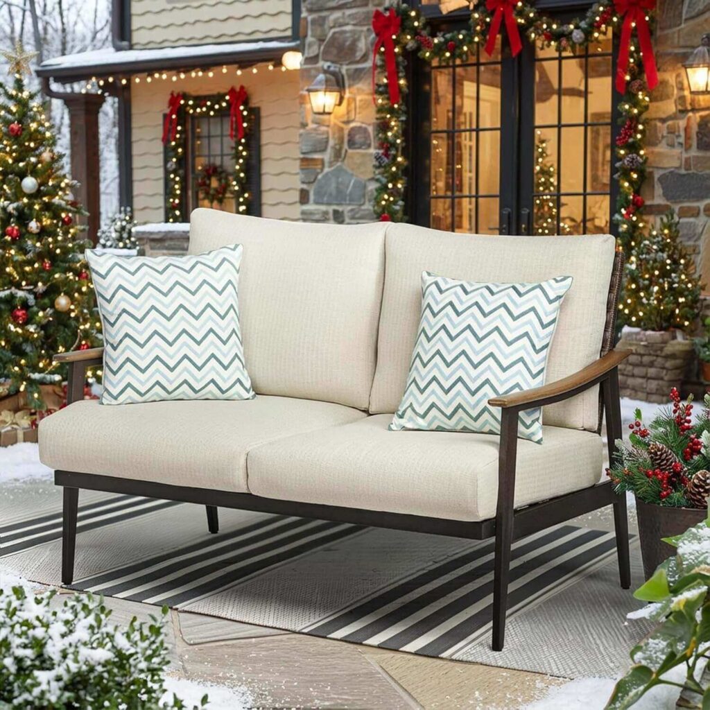 Elevate your patio with the Natural Expressions Outdoor 2 seat Sofa. Featuring 6” thick waterproof cushions, removable covers, and a stylish hollow-out rattan backrest with wood-grain armrests, it combines comfort and elegance. Lightweight yet sturdy, it fits full-sized adults perfectly. Customers love its supportive cushions and luxe look, often remarking it feels more expensive than it is. Easy to assemble and built to last, it’s a perfect addition to any outdoor space.