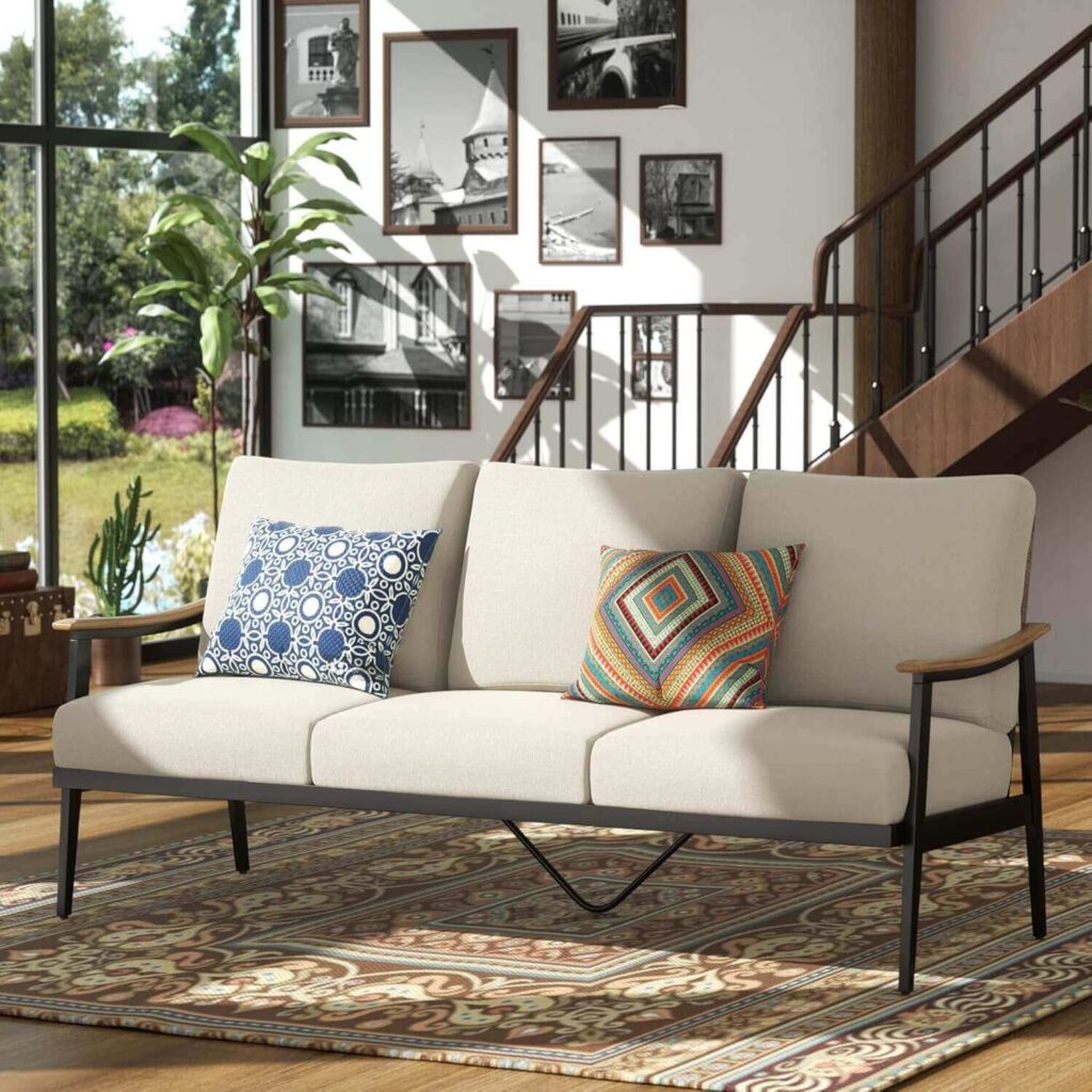 Elevate your patio with the Natural Expressions Outdoor 3 seat Sofa. Featuring 6” thick waterproof cushions, removable covers, and a stylish hollow-out rattan backrest with wood-grain armrests, it combines comfort and elegance. Lightweight yet sturdy, it fits full-sized adults perfectly. Customers love its supportive cushions and luxe look, often remarking it feels more expensive than it is. Easy to assemble and built to last, it’s a perfect addition to any outdoor space.
