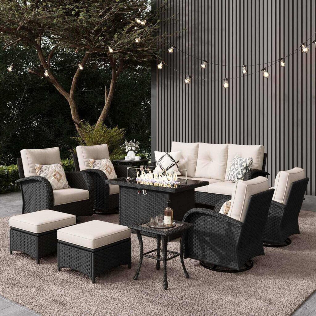 Upgrade your outdoor space with this 10 pieces Swivel & Rocking Patio Chair Set. Featuring high-back ergonomic chairs with 4-inch soft cushions and durable olefin fabric, it offers plush comfort and sturdy support on a high-strength metal frame. The chairs swivel and rock smoothly, while the 55,000 BTU fire feature adds cozy warmth for chilly evenings. Customers love the thick, comfortable cushions, rich black wicker look, and solid construction, noting it’s easy to assemble and perfect for both large and small spaces. Durable, stylish, and functional, it’s a standout addition to any patio.