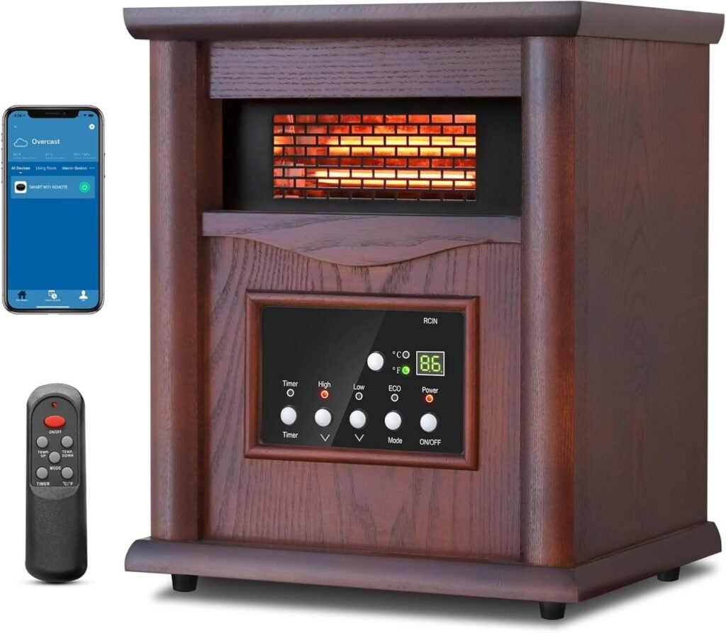 This 1500W infrared quartz heater blends elegant wood design with powerful, efficient warmth. Remote control, timer, and child-safe lock make it easy to use, while quiet operation ensures peaceful comfort. Perfect for small to medium spaces, it delivers cozy heat without drying the air. Users love its reliability, portability, and ability to keep rooms comfortably warm even in harsh winter.