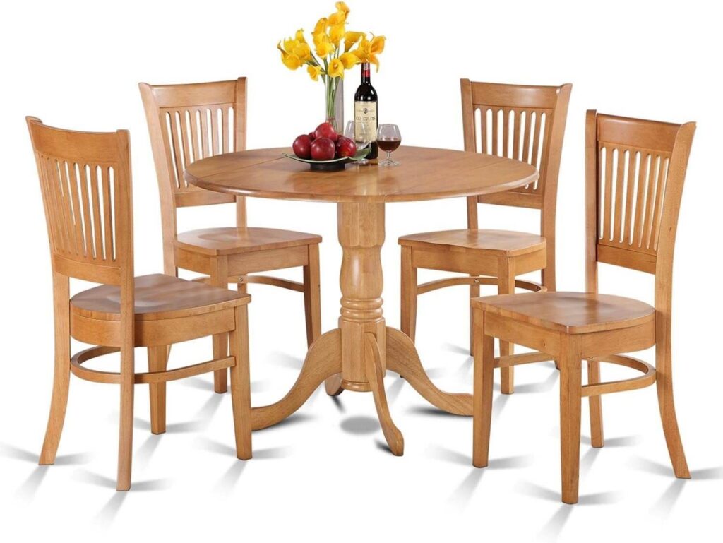 This 5-Piece Solid Wood Dining Set blends durability and style, featuring a sturdy pine table with four padded chairs for lasting comfort. Ideal for small spaces, the chairs tuck neatly under the table, keeping your area tidy. Easy to assemble and maintain, it’s praised for its quality, sturdiness, and perfect fit for cozy kitchens or apartments.