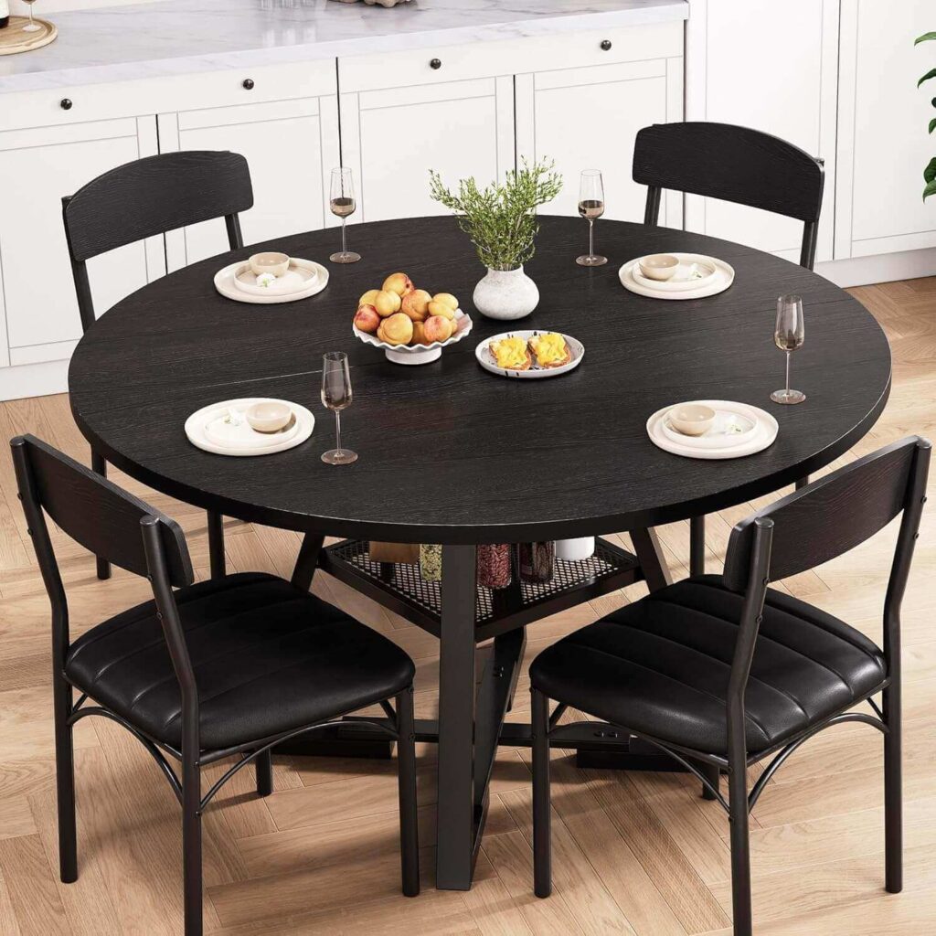 This 42-Inch Round Dining Table Set for 4 combines modern industrial style with practical functionality. The sturdy cross-base and thick MDF tabletop feel solid, while the convenient storage shelf keeps tableware organized and accessible. Easy to assemble and space-saving, it’s ideal for small kitchens or cozy family meals.