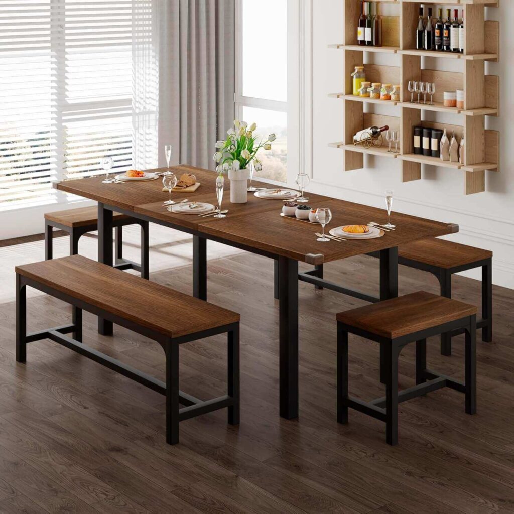 This Extendable Dining Table Set for 4–8 brings modern style and family-friendly functionality together. The smooth extendable tabletop and sliding benches make hosting easy, while the sturdy MDF and steel construction ensure lasting durability. Loved for its easy assembly, spacious design, and solid feel, it’s perfect for family meals or versatile home use.
