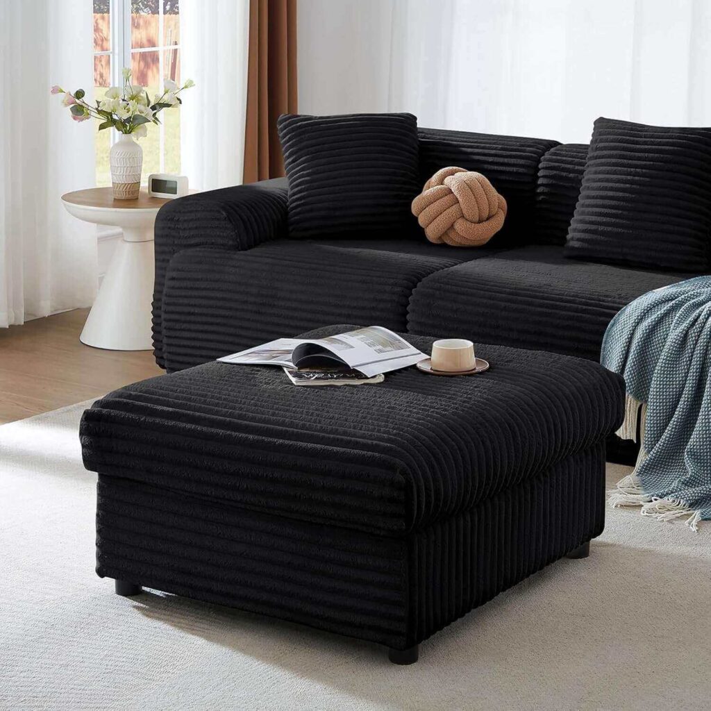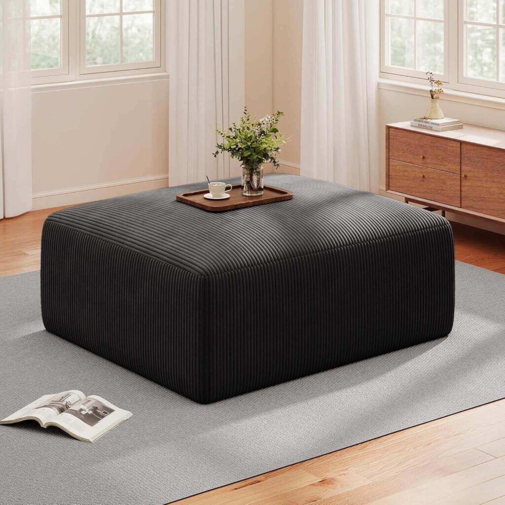 Add style and function to your living space with this large black corduroy ottoman, offering plush comfort, hidden storage for blankets or toys, and versatile use as a footrest, extra seat, or coffee table. Its solid wood frame and high-density foam cushion provide sturdy support for daily use. Customers love the surprisingly generous size, soft texture, and easy assembly that makes it a practical, elegant addition to any room.