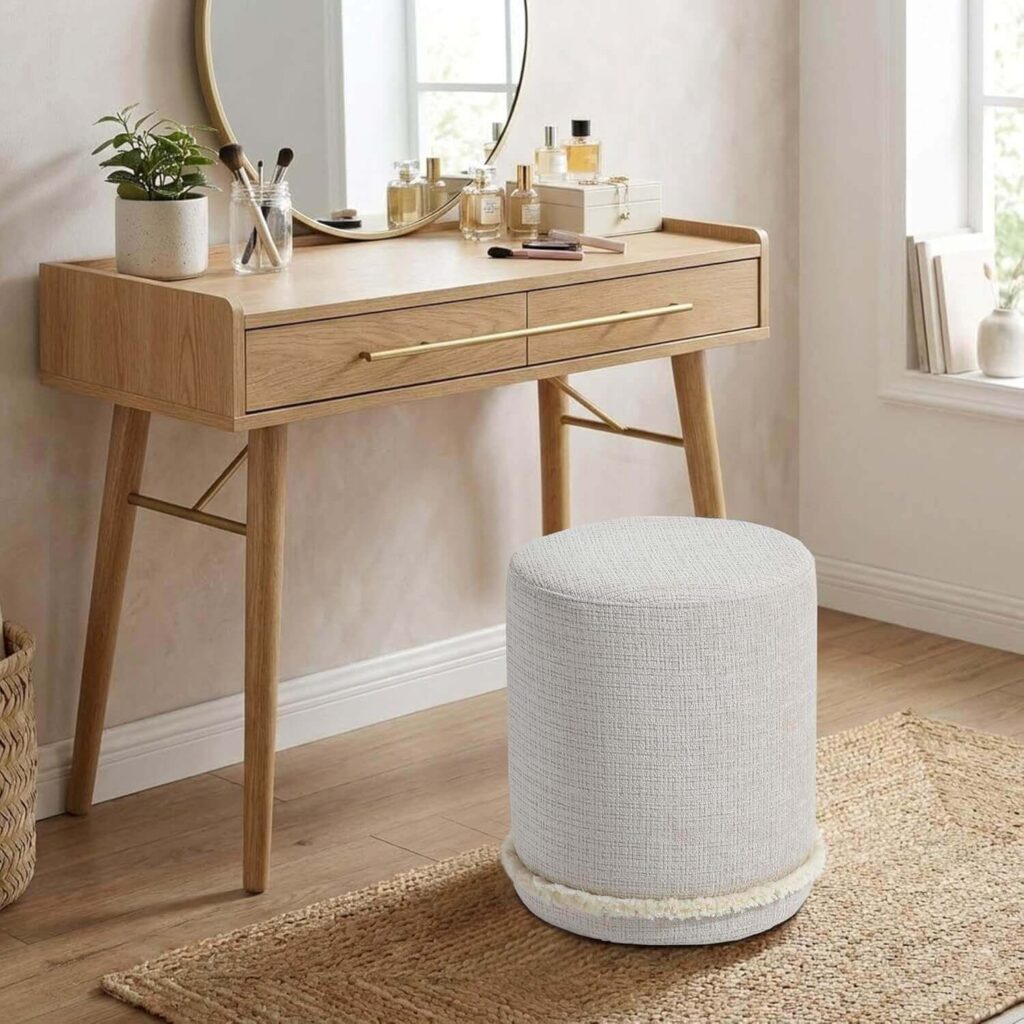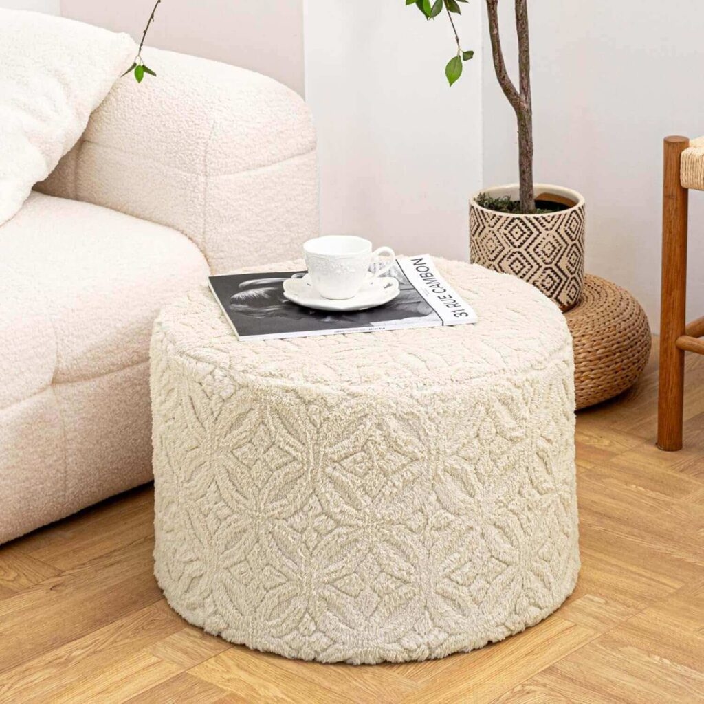 Add a touch of cozy elegance with this modern round ottoman, perfect as a vanity stool, couch footrest, or extra seating. Its plush fabric, high-density sponge cushioning, and solid wood frame provide cloud-like comfort and support up to 300 lbs, while the non-slip bottom ensures stability on any floor. The whimsical fuzzy tassel trim adds charm, making it a stylish statement piece that complements bedrooms, living rooms, or vanity areas, and it arrives ready to use—no assembly required.