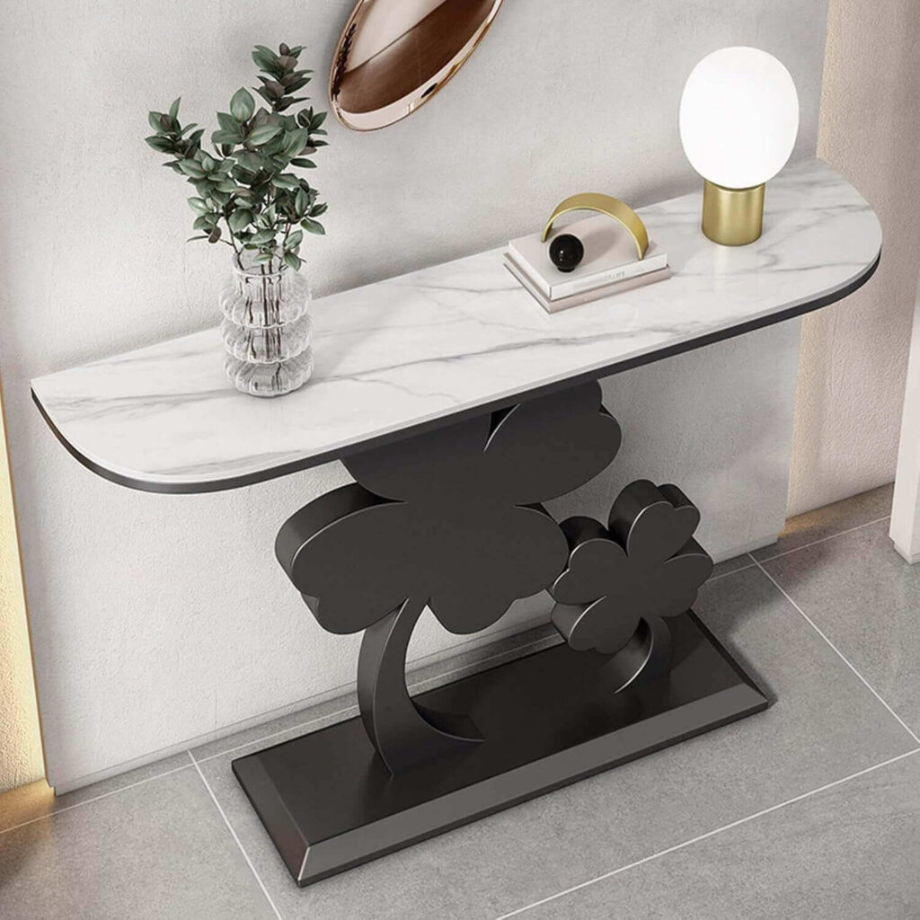 This semi-circle entryway table combines space-saving design and modern light-luxury style, perfect for narrow hallways or small living rooms. Its durable rock slab surface resists scratches, stains, and heat, while the metal frame ensures stability. Reviewers appreciate its versatility, elegance, and easy assembly, making it a stylish and functional addition to any entryway.