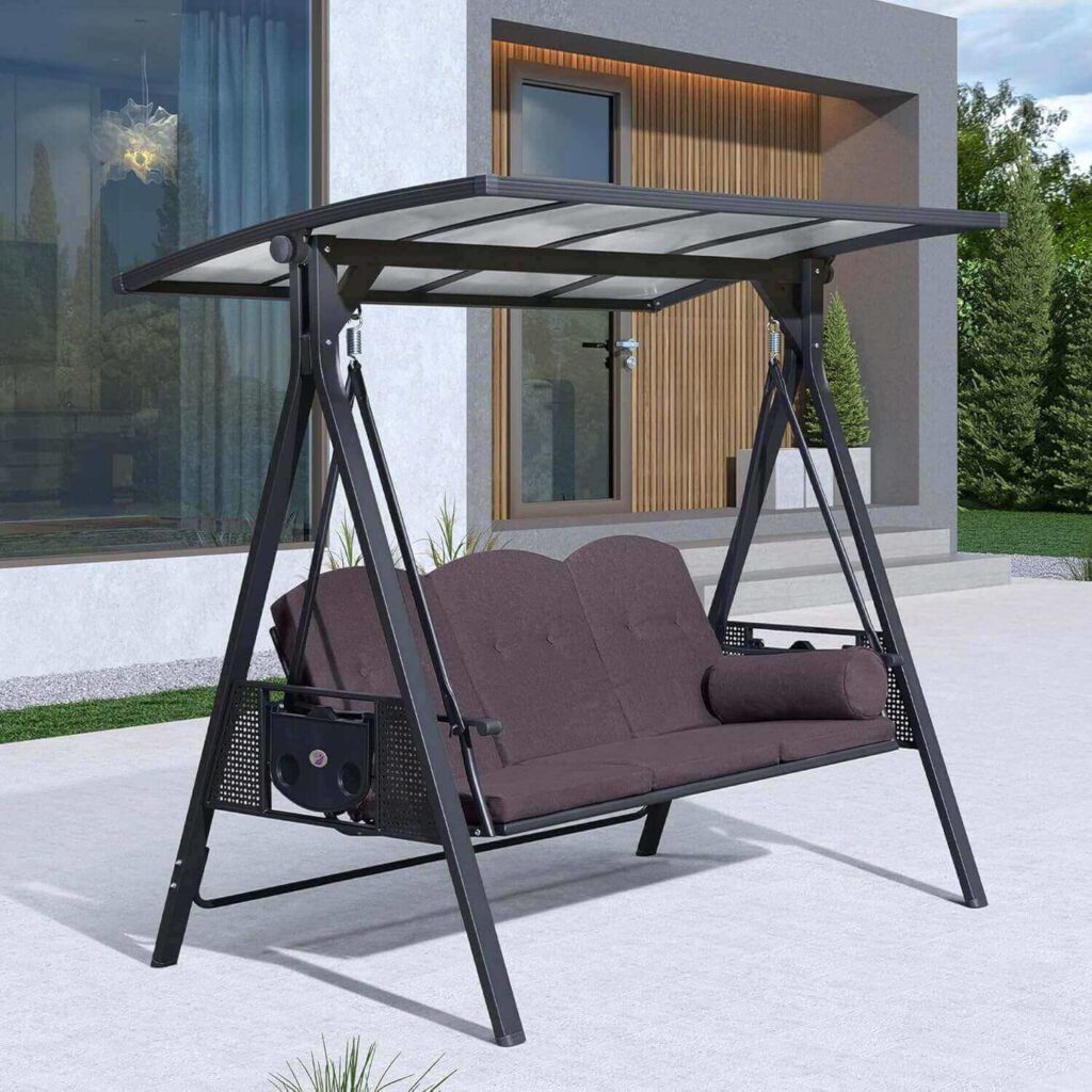 Create a comfortable outdoor retreat with this spacious porch swing featuring a durable hardtop canopy, soft cushions, and built-in side tables for added convenience. Its powder-coated steel frame and adjustable roof are designed for long-lasting use in any patio or garden setting. Buyers have appreciated the sturdy construction, easy assembly, and the unique hardtop design that allows more natural light while providing protection.