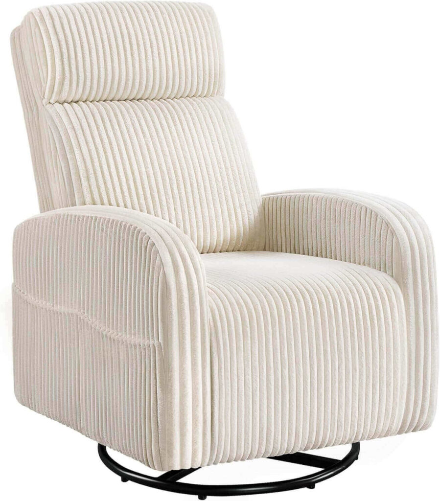 This swivel glider (Color:Beige) delivers smooth, quiet rocking and full 360° movement, making it easy to settle into the perfect position for relaxing or calming a baby. The corduroy upholstery feels soft and warm, with a high back that offers excellent support during long sitting sessions. Assembly is quick and simple, and the chair feels sturdy and well built once in place. With multiple side pockets for everyday essentials and a clean, versatile look, it’s a comfortable and practical addition to nurseries or quiet living spaces.