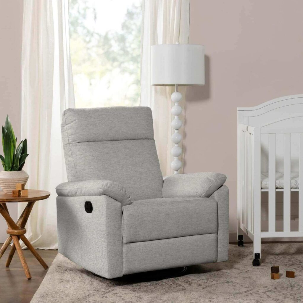 This modern glider recliner combines smooth gliding, gentle rocking, and a full 360° swivel for everyday nursery comfort. It assembles quickly and reclines fully, making it a favorite for late-night feedings and even catching some much-needed sleep. The upholstery is easy to clean, and the seat foam holds its shape and comfort even after years of use. Its soft gray tone with subtle blue undertones blends beautifully into nursery and living room spaces, offering long-lasting comfort and dependable support.