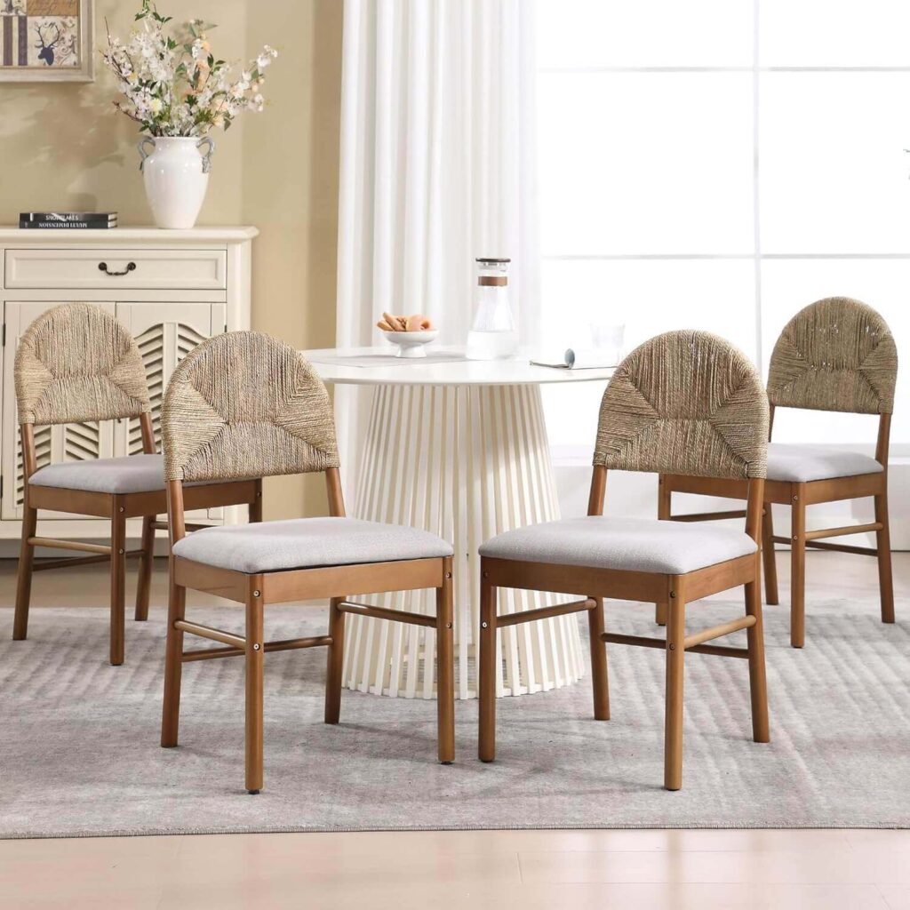 Welcome a warm farmhouse touch into your dining area with these EALSON mid century Set of 2 modern dining chairs, featuring a woven rope back and solid wood frame. Buyers often mention the supportive linen cushion, sturdy build, and how the rustic design looks just as beautiful in person as online. Easy assembly and versatile styling make these chairs a popular choice for kitchens, dining rooms, and everyday gatherings.