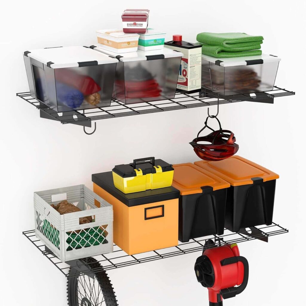 Welcome! Keep your garage or utility space organized with these heavy-duty wall mounted wire storage shelves that help store tools and equipment efficiently. The steel build and extra hanging hooks seem useful for holding heavier items while reducing floor clutter. Customers appreciate the strong construction, good finish, and practical design that works well for garages or laundry storage.