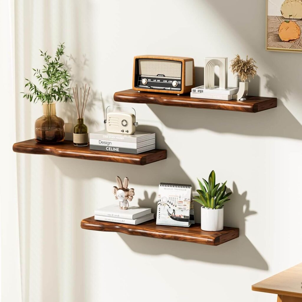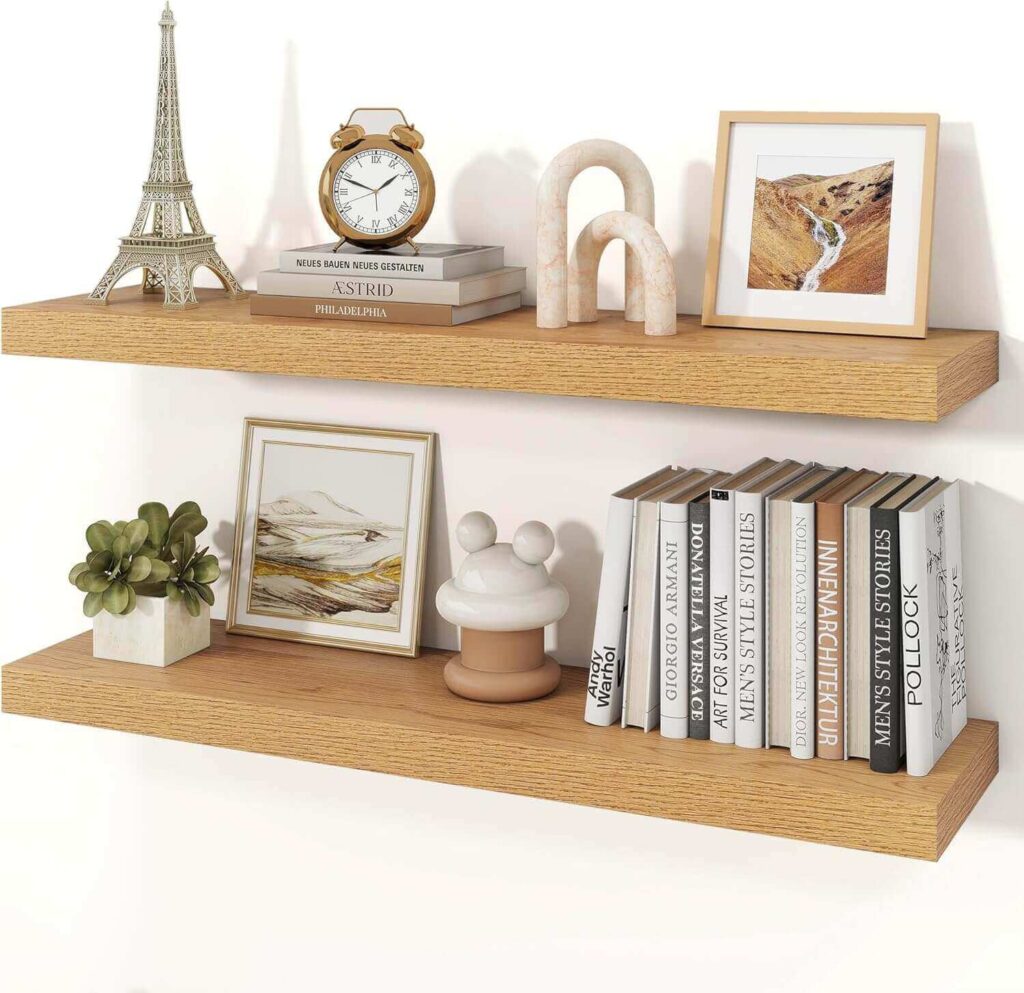 Refresh your walls with this premium duo set of floating shelves designed for clean, modern storage with a sleek invisible mount. The durable, warp-resistant finish and spacious 23″ display area seem to offer reliable support while showcasing books, plants, or décor beautifully. Customers appreciate the strong hardware, natural wood look, and easy installation that feels approachable even for beginners.