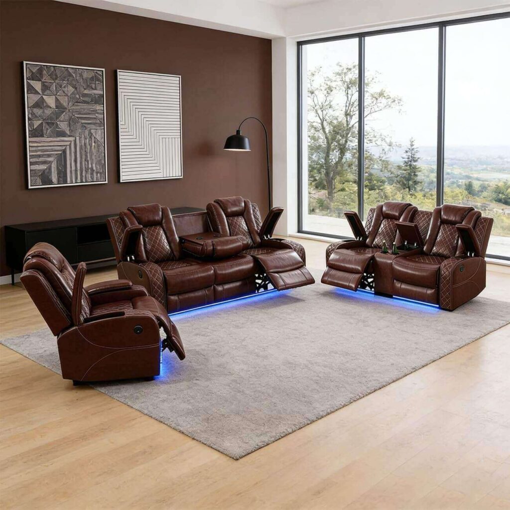 Upgrade your living room with this premium faux leather recliner sofa set, featuring soft, skin-friendly upholstery and durable, easy-to-clean material for everyday use. The power reclining ergonomic seats with dual-layer springs provide personalized comfort, while built-in LED theater lights create a cozy, cinematic atmosphere. Loved for its quick setup, modern features, and comfortable design, it’s perfect for movie nights or relaxing in style.