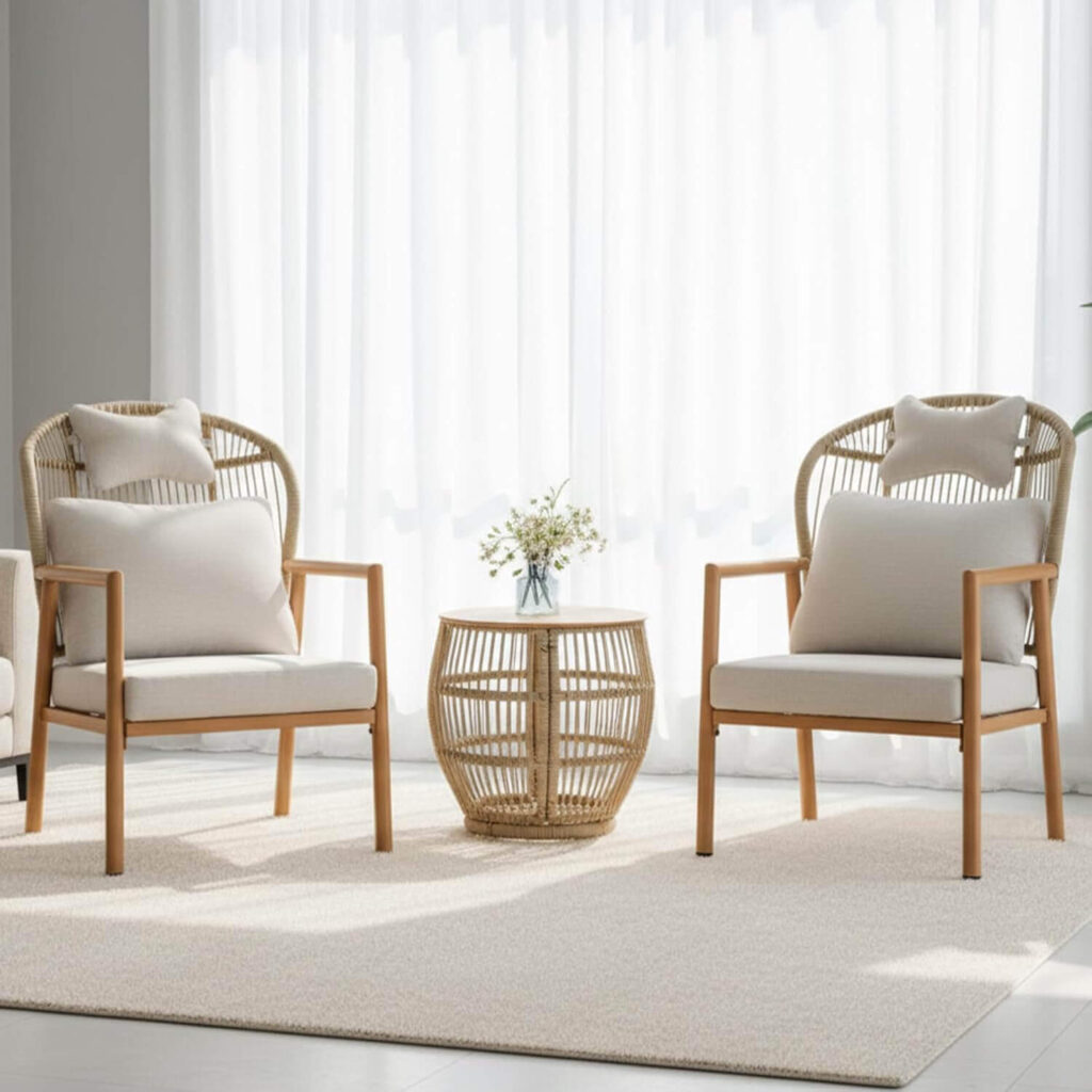 A beautifully balanced outdoor sofa set, inspired by a bird’s-nest shape with curved arms and deep cushions that feel both cozy and refined. Built with a rust-free aluminum frame, woven rope detailing, and thick, breathable cushions, it’s designed to handle all weather without looking bulky. Customer reviewers love the unique look, sturdy quality, and perfectly sized pieces that work just as well in small patios as larger outdoor spaces.