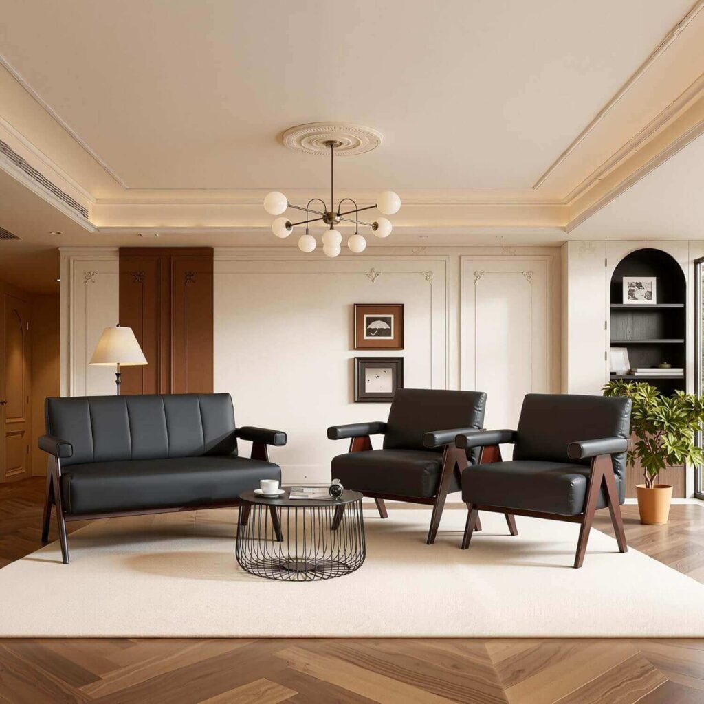 Make your office or home welcoming with this mid-century modern sofa and chair set, featuring plush 7-inch cushions, supportive armrests, and a relaxed backrest for all-day comfort. The solid wood frame and waterproof faux leather provide lasting durability while the sleek design elevates any space. Often praised for being easy to assemble and incredibly comfortable, it’s a favorite for lobbies, offices, or stylish living rooms.