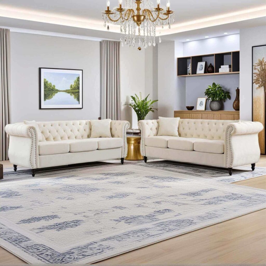 A lovely way to refresh your space, this 2-piece 80″ classic Chesterfield velvet sofa set offers timeless style with plush, ergonomic comfort for lounging, relaxing, or entertaining. The solid wood frame, tufted low back, and elegant nailhead trim add a refined touch while removable cushions make everyday care easy. Often praised for fitting the room’s vibe perfectly and being easy to assemble, it’s seen as a comfortable, stylish choice with only minor finishing details to note.