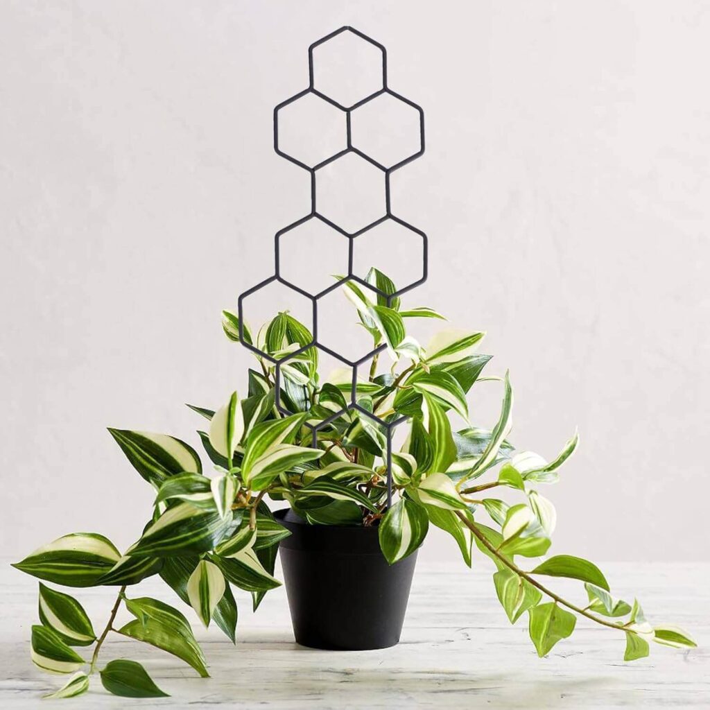 This 15.94 inch & 2 pack metal honeycomb trellis provides sturdy support for climbing plants in pots, making it ideal for sugar snap peas, green beans, small peppers, and other indoor or outdoor vines. Made from virgin iron with a powder-coated finish, it resists rust and ensures long-lasting durability. The set includes two trellises and 100 ties, offering flexibility for multiple potted plants. Customers appreciate its stylish design and easy placement, noting that it helps plants grow happily while adding a decorative touch. Many mention that it works perfectly for small pots and delivers excellent value for a durable plant support.