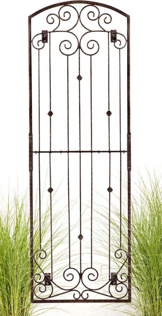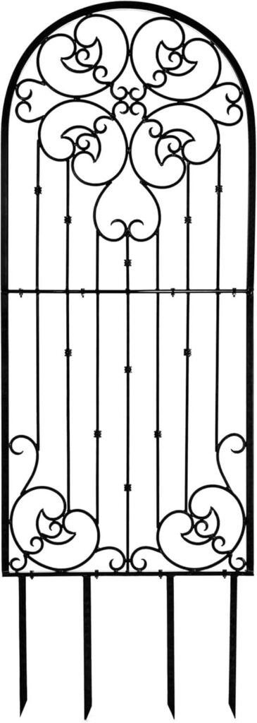 This heavy-duty wrought iron trellis combines strength and elegance, making it ideal for garden entrances, patios, or as a privacy screen. Measuring 32 inches wide and 72 inches tall with 17.5-inch ground spikes, it securely supports climbing plants like roses, ivy, clematis, and jasmine. Customers praise its sturdy construction, attractive scrollwork, and durable powder-coated finish that withstands the elements. Many note that assembly is straightforward with two people and that the trellis adds both functional support and lasting beauty to any outdoor space.