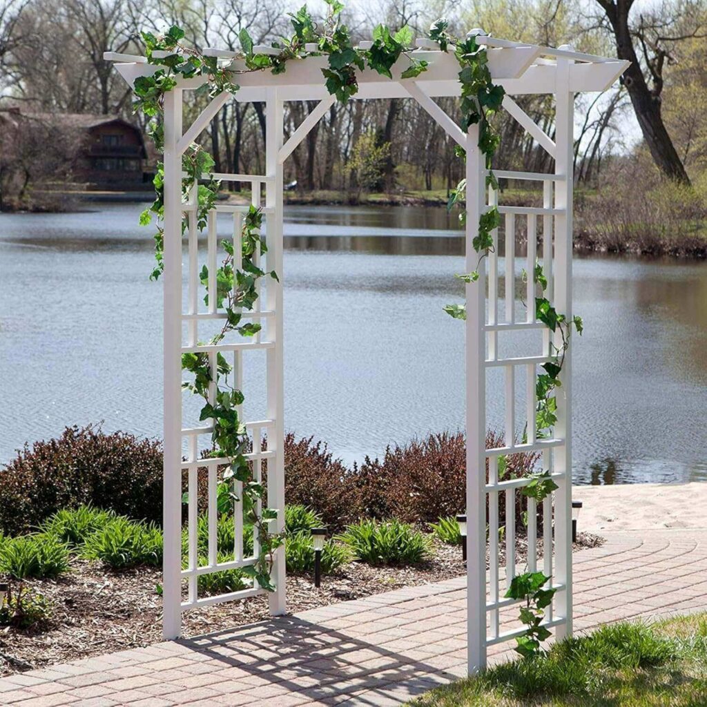 This modern grid-style arbor offers a contemporary look while providing sturdy support for climbing plants and vines. Made from durable PVC with stabilizers, it resists cracking, fading, peeling, and discoloration, ensuring long-lasting use outdoors. Customers note that assembly is straightforward with pre-drilled pieces and ground anchors, though two people may find it easier to set up. Many appreciate its stylish design, stability in wind, and versatility for gardens, wedding arches, or photo backdrops. It adds both functionality and visual appeal to any outdoor space.
