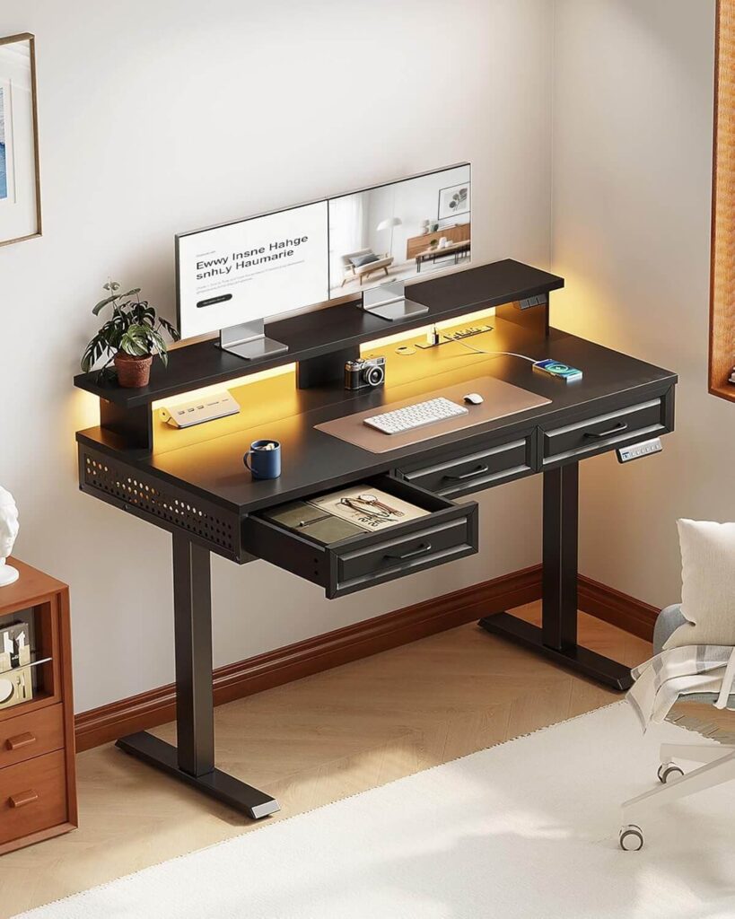 This 48-inch electric standing desk offers smooth height adjustment, three wooden drawers, and a full monitor shelf for ergonomic comfort. Built-in outlets, LED lighting, and cable management keep your workspace organized. Its sturdy frame supports dual monitors and laptops effortlessly, while the sleek all-black design adds a modern touch to any home office.
