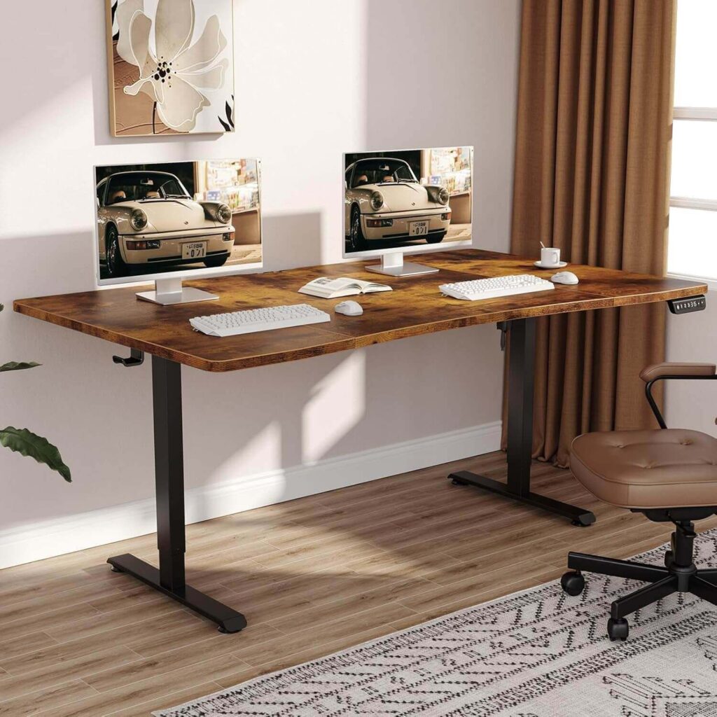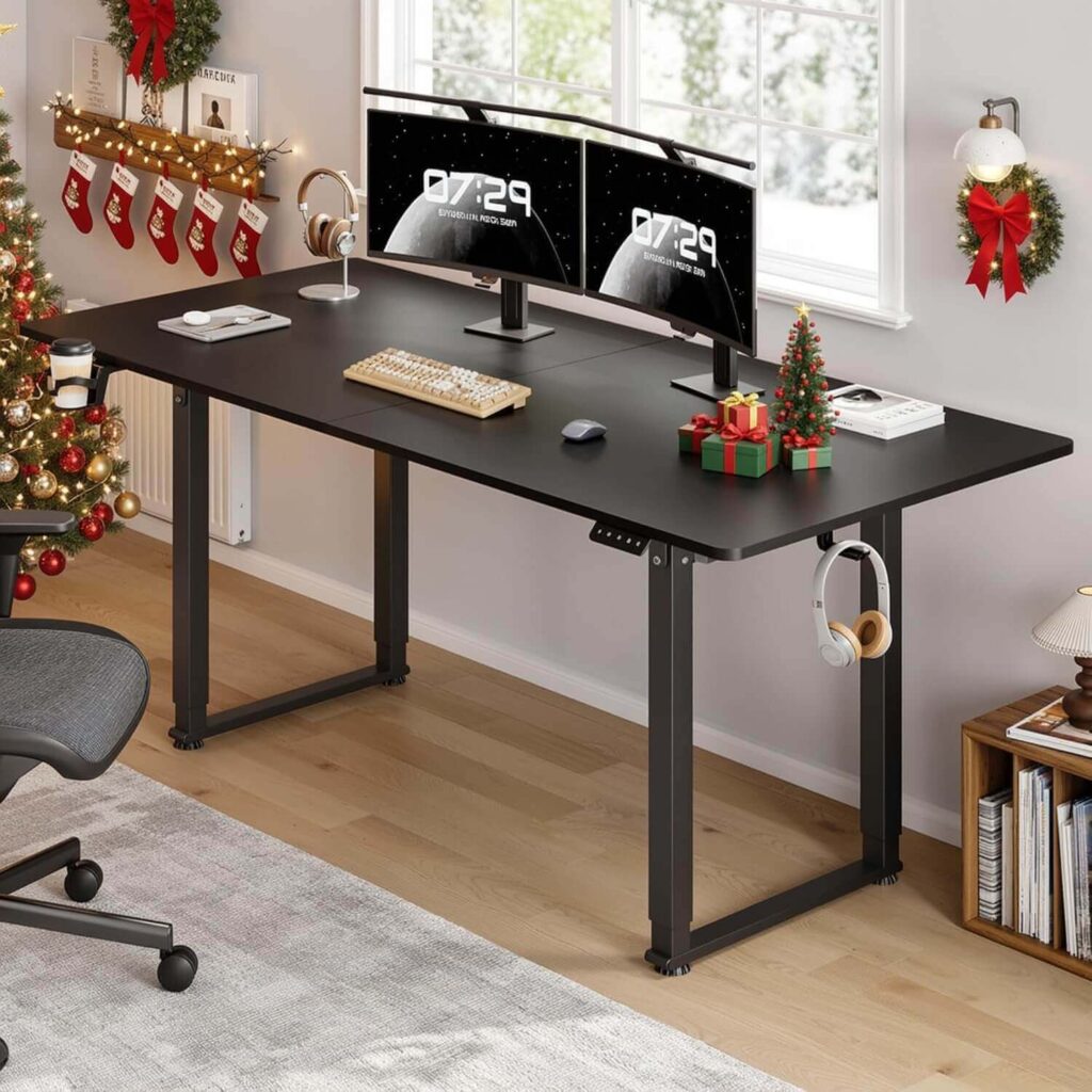 This electric height-adjustable standing desk features a spacious three-piece desktop with ample depth for monitors, laptops, and work essentials. A thicker panel and dual-beam steel frame ensure durability and stable, smooth height transitions. Cable management keeps your workspace tidy, while three memory presets offer personalized comfort. Easy assembly and solid construction make it a reliable, high-value choice for home or office use.