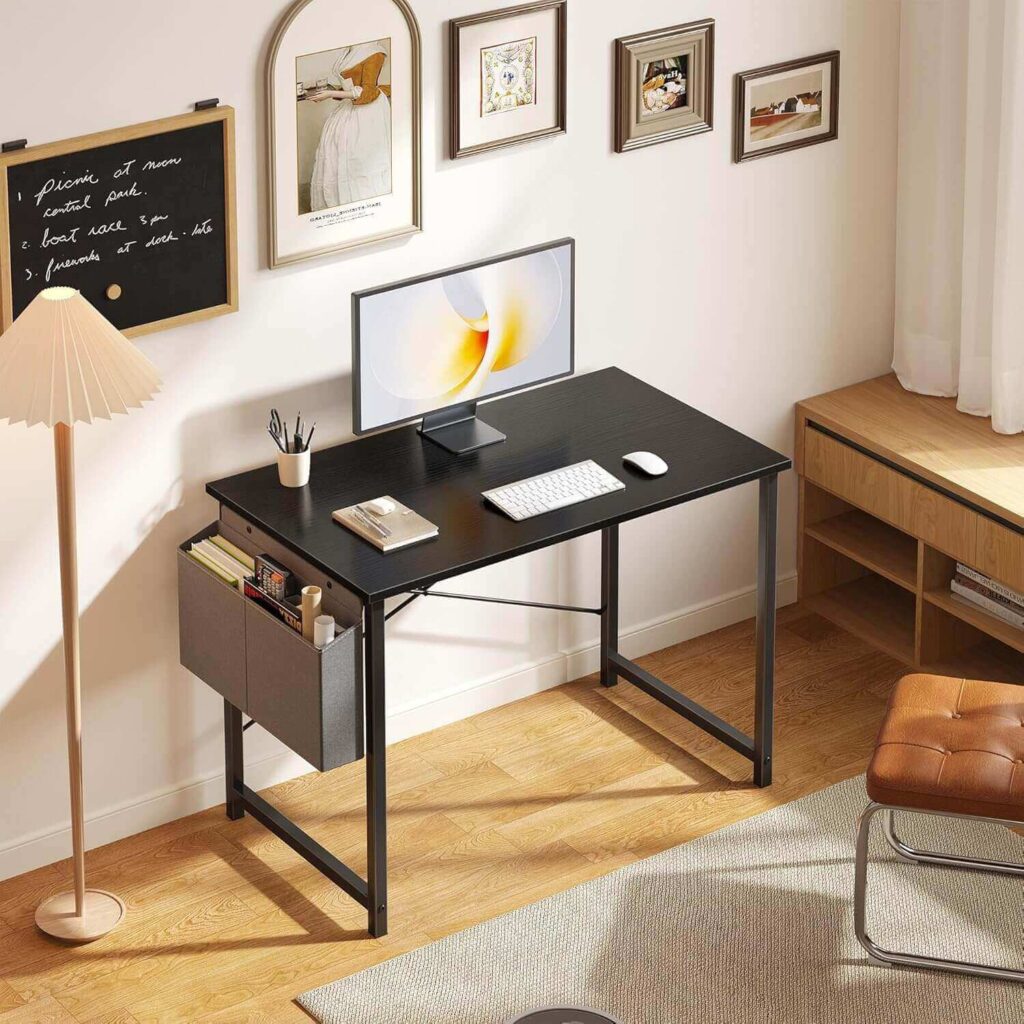 This modern work desk offers a sturdy, spacious surface that comfortably supports daily work, study, or gaming setups. Its clean design fits neatly into small rooms while still providing room for essential gear. The added side storage pocket helps keep everyday items organized and within reach. Easy assembly and reliable stability make it a practical upgrade from compact or temporary setups.