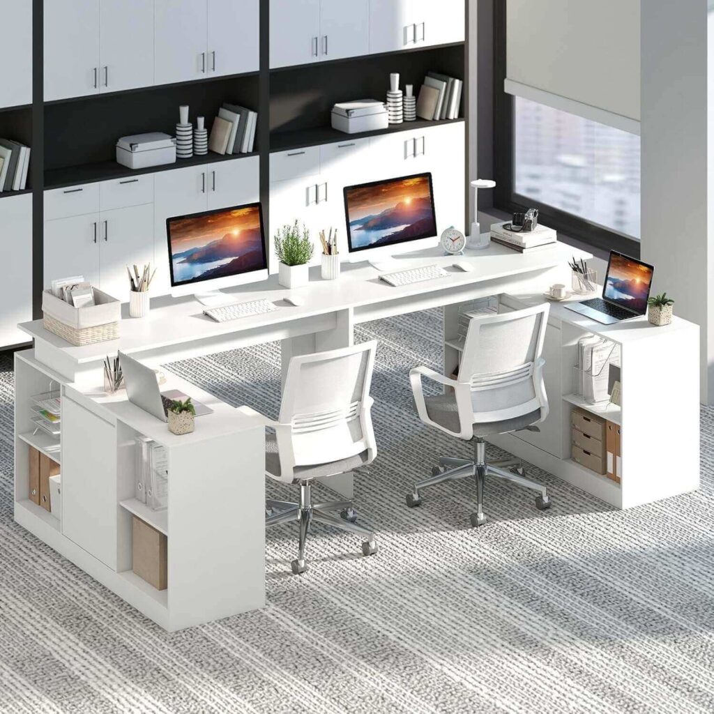 This reversible L-shaped desk features a flexible 48″ layout and storage cabinet, easily fitting any corner. Two-way storage with a cabinet and open compartments keeps essentials organized without crowding legroom. Reinforced construction ensures stability, while soft-close hinges and roomy under-desk space offer comfort during long sessions. Its modern design blends seamlessly into offices, dorms, or creative workspaces.