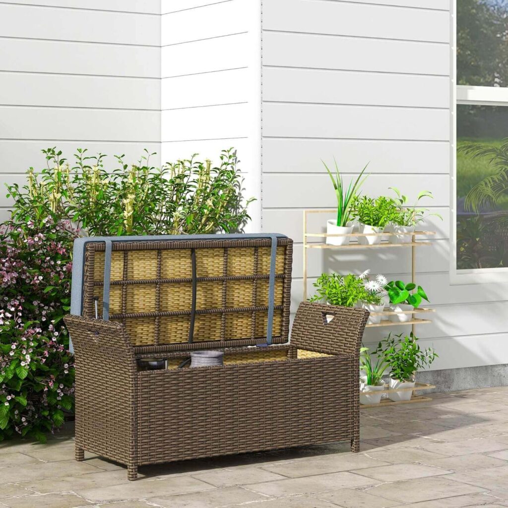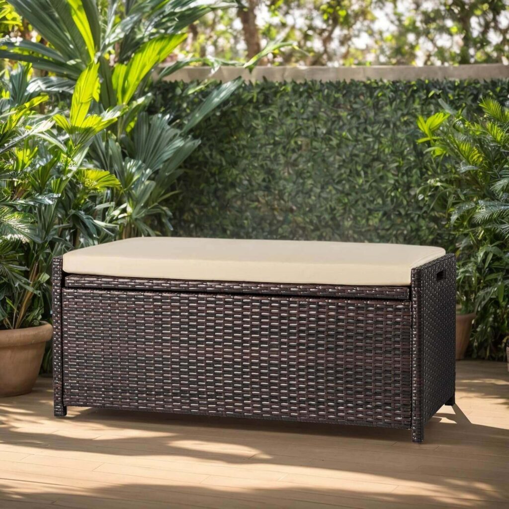 This versatile storage bench is perfect for organizing outdoor essentials while also providing comfortable seating. It’s ideal for storing pool toys, patio cushions, or gardening supplies, and features a stylish basket weave design that looks great in any outdoor or indoor space. Assembly is simple enough to do solo, and the included cushion adds extra comfort for sitting. Plus, it’s sturdy enough to support an adult, making it a practical and attractive addition to your patio, sunroom, or garden.