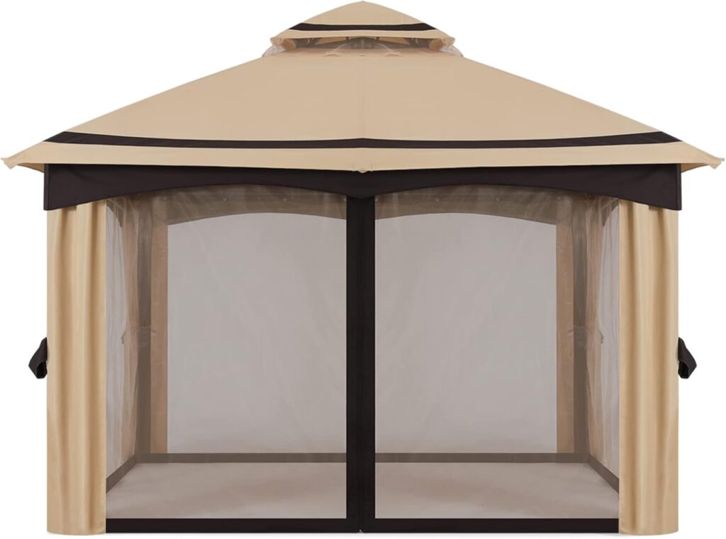 The Yaheetech 11×11 Patio Gazebo with Sidewalls is a stylish, durable outdoor shelter with easy assembly.Thanks to clear instructions and labeled parts. Its sturdy construction stays secure once built, though the included Allen wrench may wear over time. The water-repellent canopy protects from rain, while mesh sidewalls keep out mosquitoes and flies without blocking airflow. A top vent provides extra ventilation, ensuring comfort on warmer days.