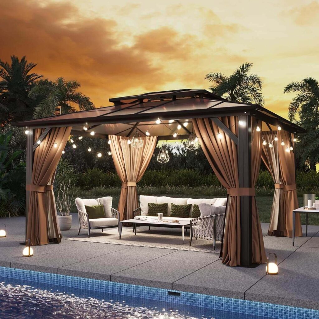 Elevate your outdoor space with this polycarbonate-roofed gazebo, built for style, durability, and year-round use. Unlike cloth models that need tarps, its hardtop design offers lasting protection.one owner noted it feels like a solid investment compared to their old 4–5 year fabric canopy. The 10×13 size fits loveseats, firepits, and more, standing strong against hurricane winds and snow. Though setup takes a few hours and is best done with professional help, the finished result — especially with an added ceiling fan — makes it the perfect all-season retreat.