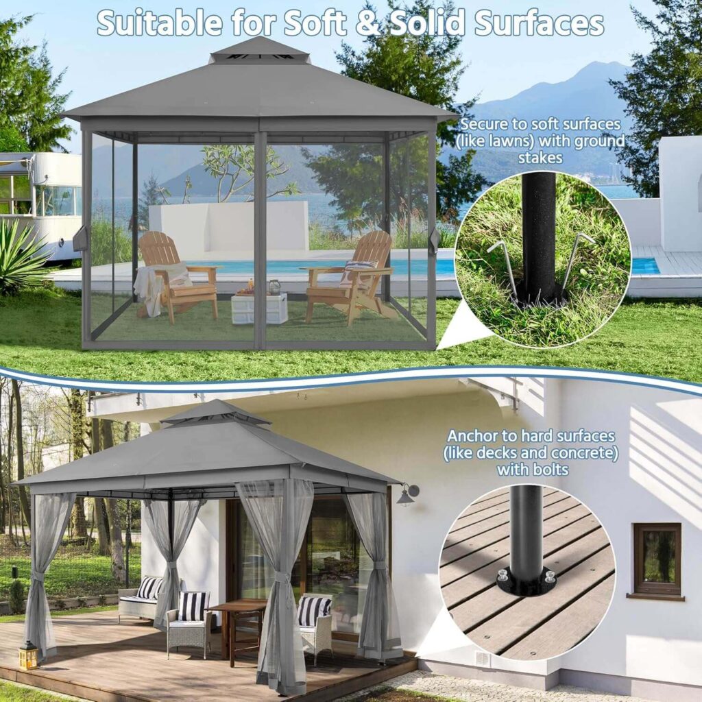 Make a bold statement with this 12×20 galvanized gazebo, combining durability and elegant design. While assembly needs two tall people or a small team, the sturdy structure withstands rain and heavy winds. The double roof ensures airflow and weather resistance, and the base can be secured to your deck for added stability. Zip-up netting provides privacy and bug protection, creating a peaceful outdoor retreat that elevates any backyard or deck.