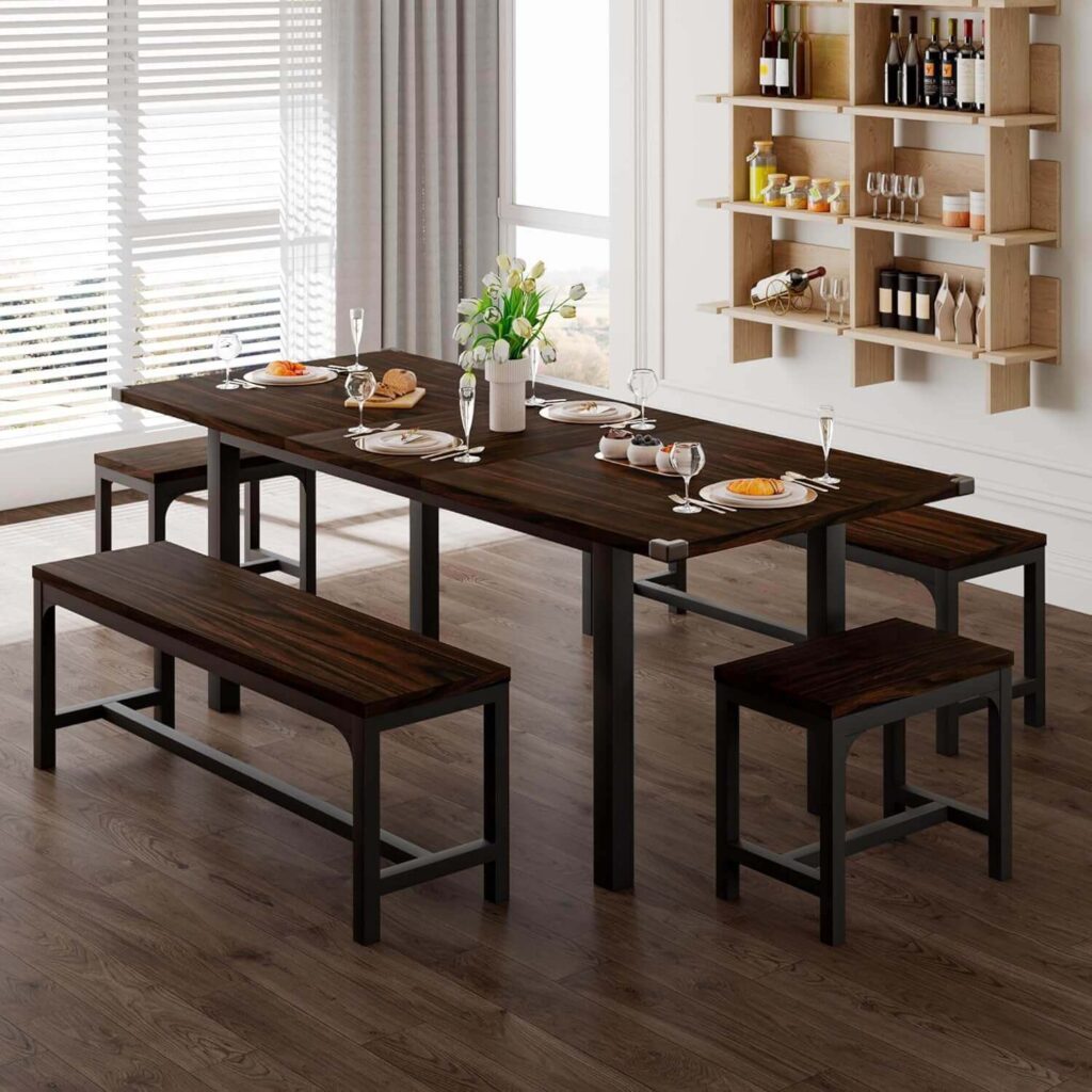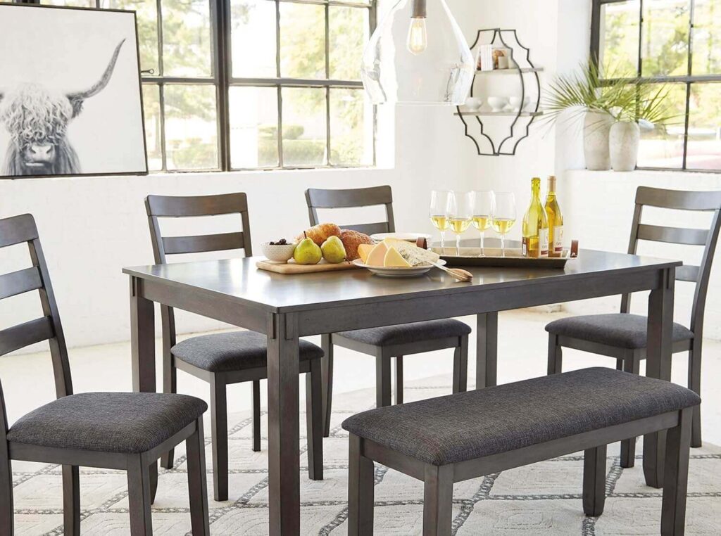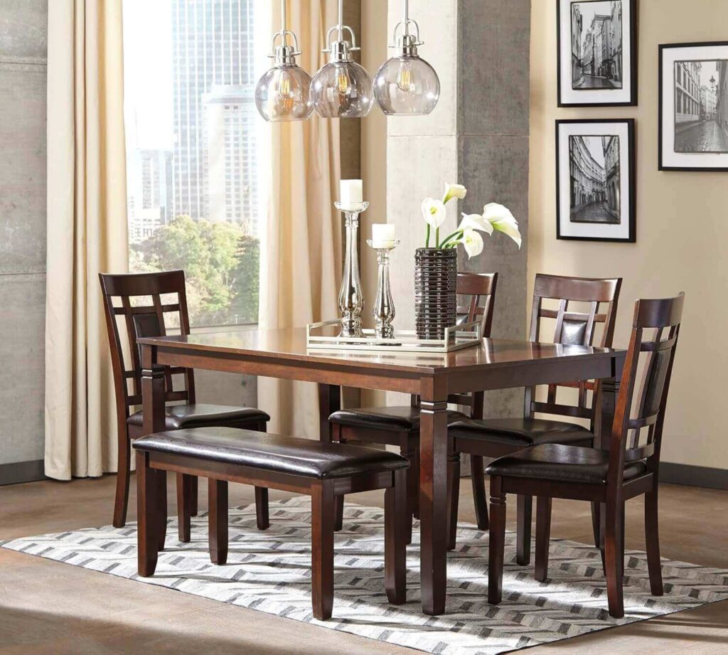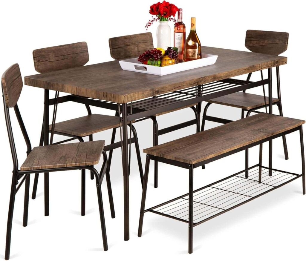 Spacious Seating: Includes a table, four chairs, and a bench—ideal for family dining.