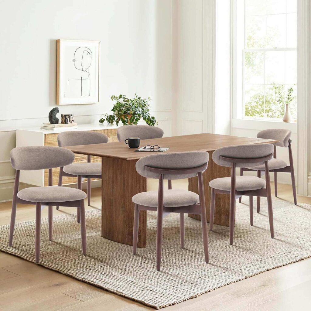 Upgrade your dining space with this stylish 6-piece set that comfortably seats six and brings a warm, contemporary look to any home. With clean lines, soft upholstery, and a rich brown finish, it’s perfect for everyday meals and cozy gatherings.