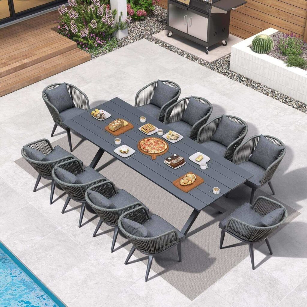 Upgrade your outdoor space with this modern, all-weather dining set designed for durability, comfort, and style. The spacious 10-seat layout, premium materials, and elegant rope-weave details make it perfect for hosting family dinners or gatherings.