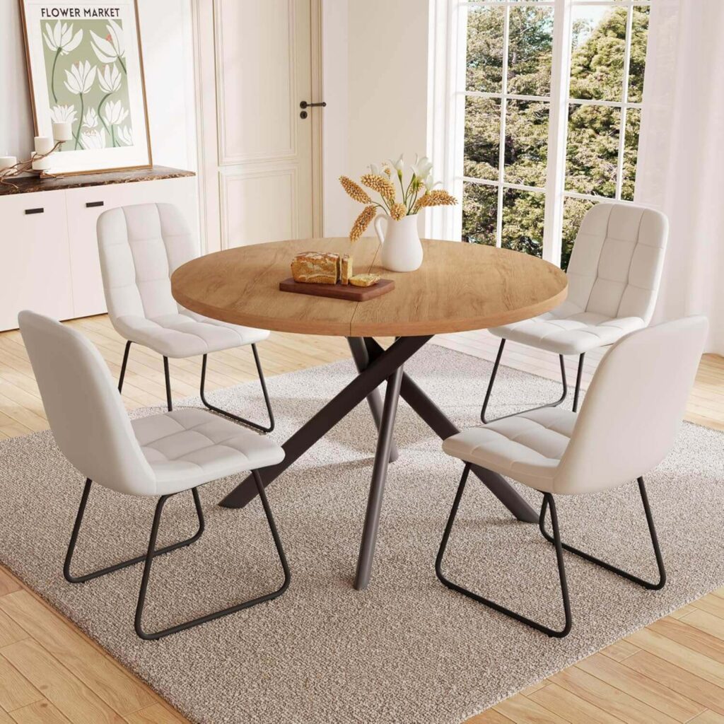 Bring style and comfort to your dining area with this modern round table set designed for effortless everyday use. Its sleek design, durable materials, and easy maintenance make it a perfect match for small to medium spaces.