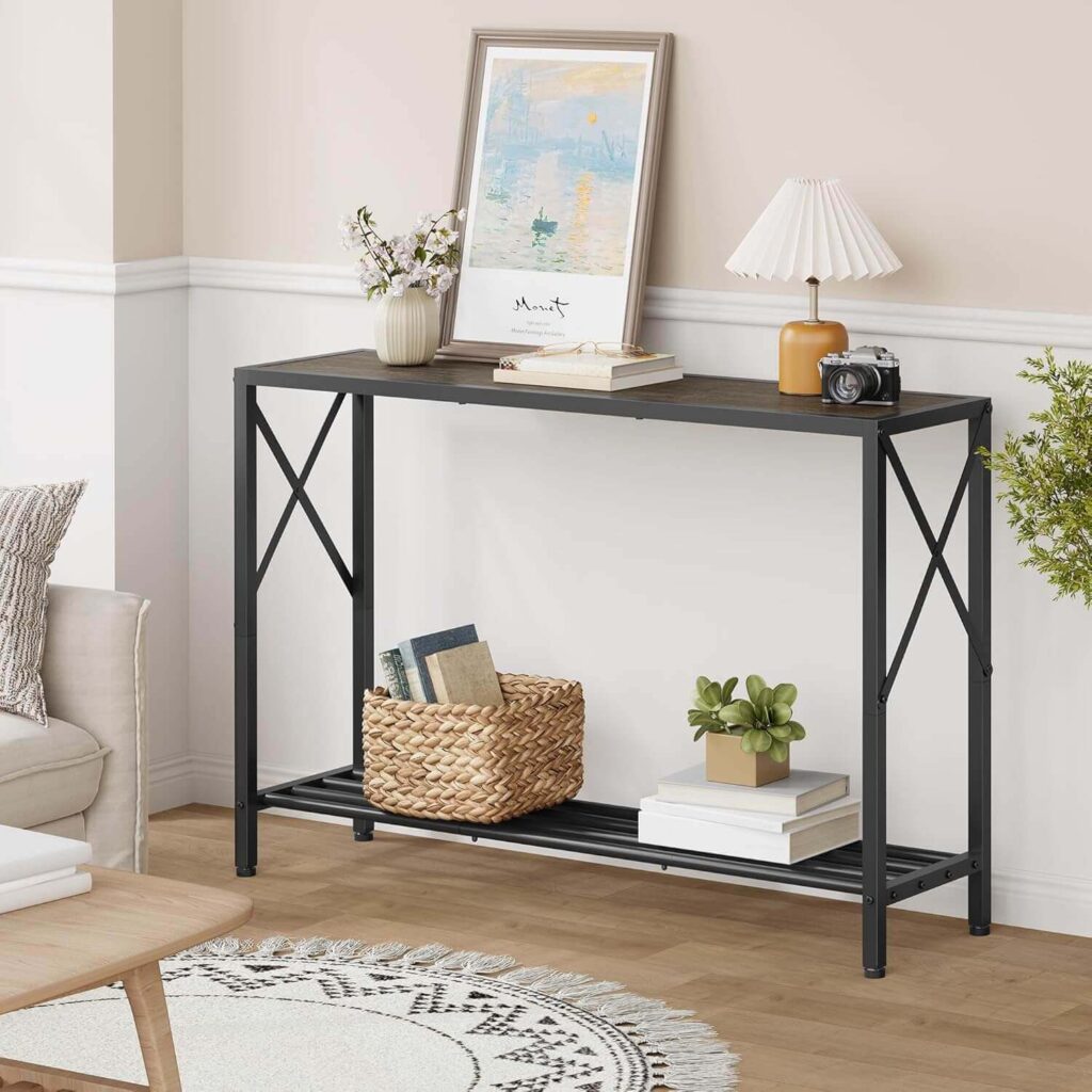 This modern industrial console table (Rustic Brown & Black) blends a black metal frame with dark grey wood panels, adding a sleek touch to any narrow space. Its slim 2-tier design offers extra storage for books and décor while keeping your entryway or hallway uncluttered. Built with sturdy materials and an X-shaped frame, it stays stable, aided by adjustable feet for uneven floors. Customers love its real-wood feel, easy assembly, and perfect fit for small spaces—even using it as a compact TV stand. A stylish, durable piece that works beautifully anywhere.