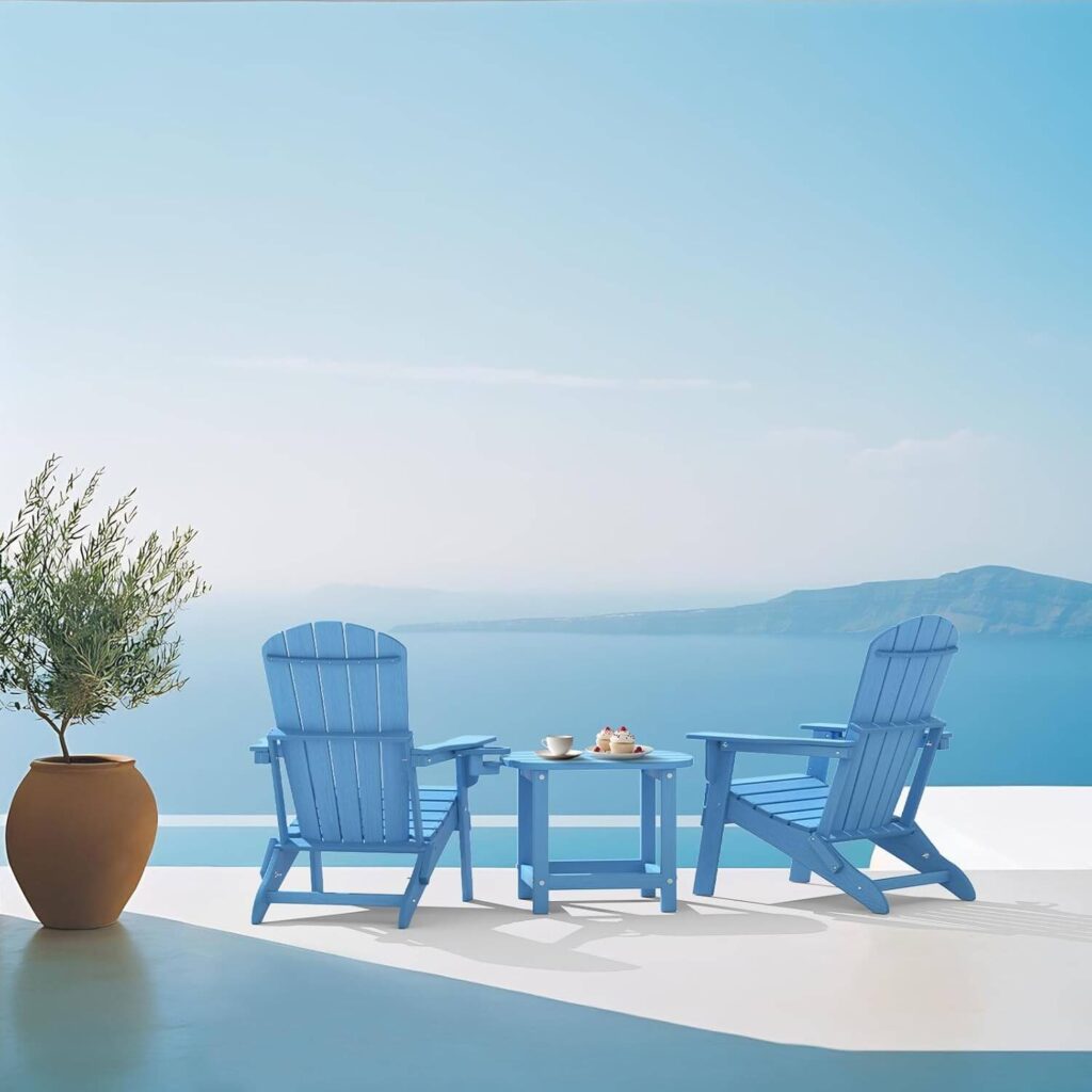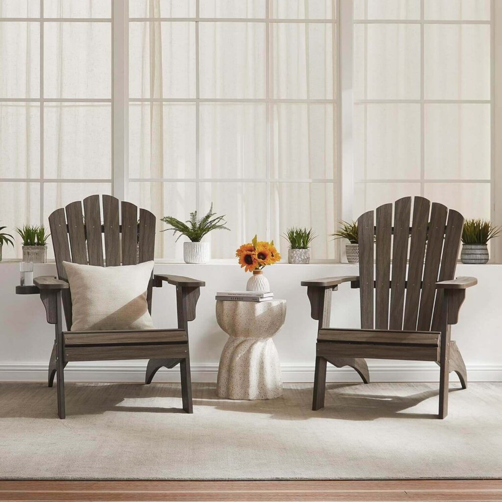 These Adirondack chairs(Set of 2) are built with durable, weather-resistant HDPE that mimics real wood and stays strong through sun, snow, wind, and coastal conditions. Wider armrests, adjustable cup holders, and accurate construction make them sturdy, comfortable, and easy to assemble. They fold easily for storage and maintain consistent color and texture for a clean outdoor look. Customers love their solid feel, quick setup, and comfort. Many also praise the responsive customer service, noting fast replacements for minor issues.