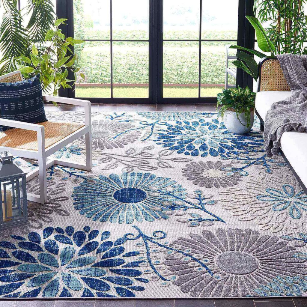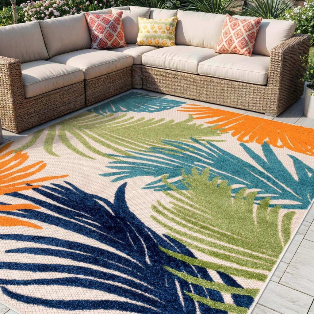 This 12′ x 15′ Lucca rug (Multi Color) is crafted from 100% durable polypropylene, bringing a bold navy, gray, and floral design to patios, decks, or indoor spaces. Its flat-weave, weather-resistant construction resists fading, stains, and shedding, making it perfect for high-traffic areas. Customers love the vibrant colors and how it instantly brightens any space, noting that it cleans easily and remains durable over time. Many also praise its versatility, non-slip stability, and the way it adds a tropical, lively touch to both indoor and outdoor areas.