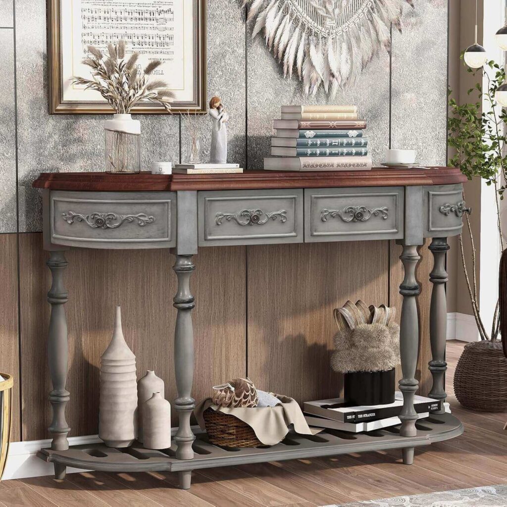 This 52″ half-moon console table (Color:B-antique Grey) offers a perfect blend of vintage elegance and modern functionality, featuring a sturdy pine wood frame, solid wood and MDF tabletop, two drawers, and a bottom shelf for versatile storage. Its exquisite curved design, Roman-style legs, and detailed carvings make it a charming focal point in any room. Easy to assemble with pre-assembled top and drawers, it fits beautifully in entryways, hallways, or living rooms. Customers love its quality and style, noting it looks great, is solidly built, and adds a sophisticated yet approachable touch to their home.