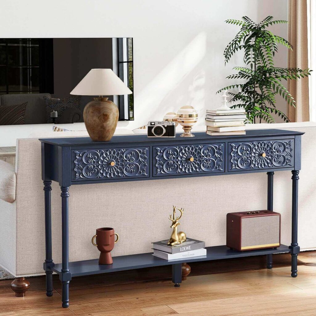 This elegant 55.5-inch console table (Color:Midnight Blue) features a carved floral design with a glossy finish, adding artistic charm to any entryway, hallway, or living room. It offers practical storage with three smooth-gliding drawers and a lower shelf to keep essentials organized. Built with solid wood legs and a central support, it’s sturdy and reliable for daily use. Customers love its design and functionality, noting it’s adorable, matches their décor perfectly, and while assembly takes some time, it’s well worth the effort.