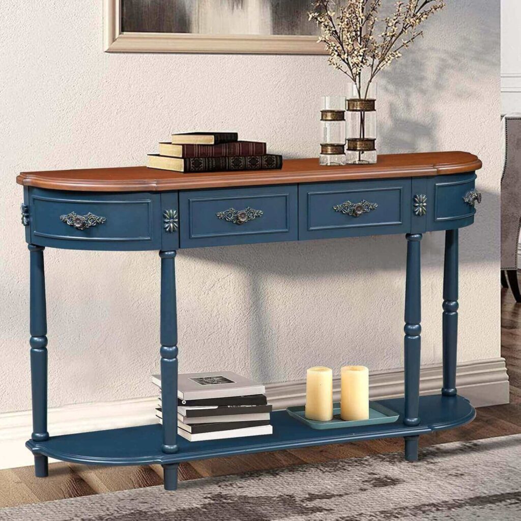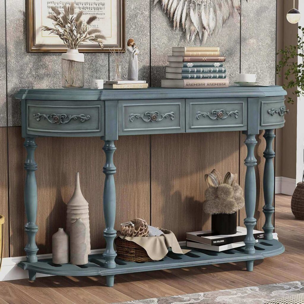 This 52″ half-moon console table (Color:B-antique Blue) offers a perfect blend of vintage elegance and modern functionality, featuring a sturdy pine wood frame, solid wood and MDF tabletop, two drawers, and a bottom shelf for versatile storage. Its exquisite curved design, Roman-style legs, and detailed carvings make it a charming focal point in any room. Easy to assemble with pre-assembled top and drawers, it fits beautifully in entryways, hallways, or living rooms. Customers love its quality and style, noting it looks great, is solidly built, and adds a sophisticated yet approachable touch to their home.