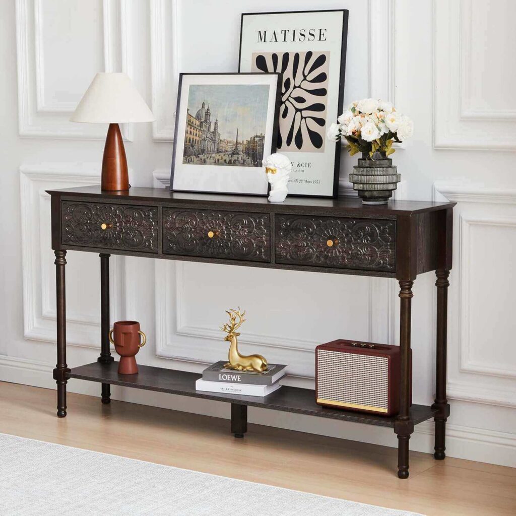 This elegant 55.5-inch console table (Color:Antique Black-brown) features a carved floral design with a glossy finish, adding artistic charm to any entryway, hallway, or living room. It offers practical storage with three smooth-gliding drawers and a lower shelf to keep essentials organized. Built with solid wood legs and a central support, it’s sturdy and reliable for daily use. Customers love its design and functionality, noting it’s adorable, matches their décor perfectly, and while assembly takes some time, it’s well worth the effort.