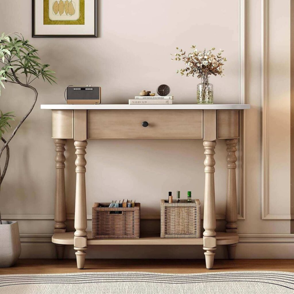 This 60-inch wood console table (Color:Antique White) blends rustic farmhouse charm with practical functionality, featuring a two-tier design with a spacious drawer and slatted lower shelf for organizing keys, shoes, or décor. Crafted from premium wood with a reinforced base, it offers sturdy support for lamps, books, and decorative items. Versatile enough for entryways, hallways, or behind sofas, it adds both style and storage to any space. Customers love its solid feel, easy assembly, and charming finish, noting how it instantly enhances their home’s warmth and practicality.