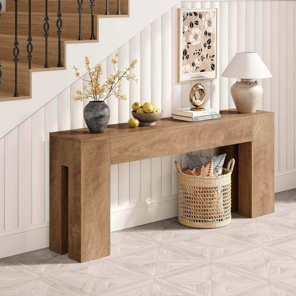This 63-inch entryway table in warm oak finish brings rustic farmhouse charm to any space while offering plenty of surface area for lamps, photos, or decorative trays. Built with premium MDF and a reinforced trapezoidal base, it’s sturdy enough for daily use yet lightweight for easy portability. The open bottom shelf and smart dimensions make it perfect for storing baskets, keys, or other essentials in tight spaces. Customers love its affordability, easy assembly, and versatile style, noting it fits beautifully in their entryways without looking out of place.