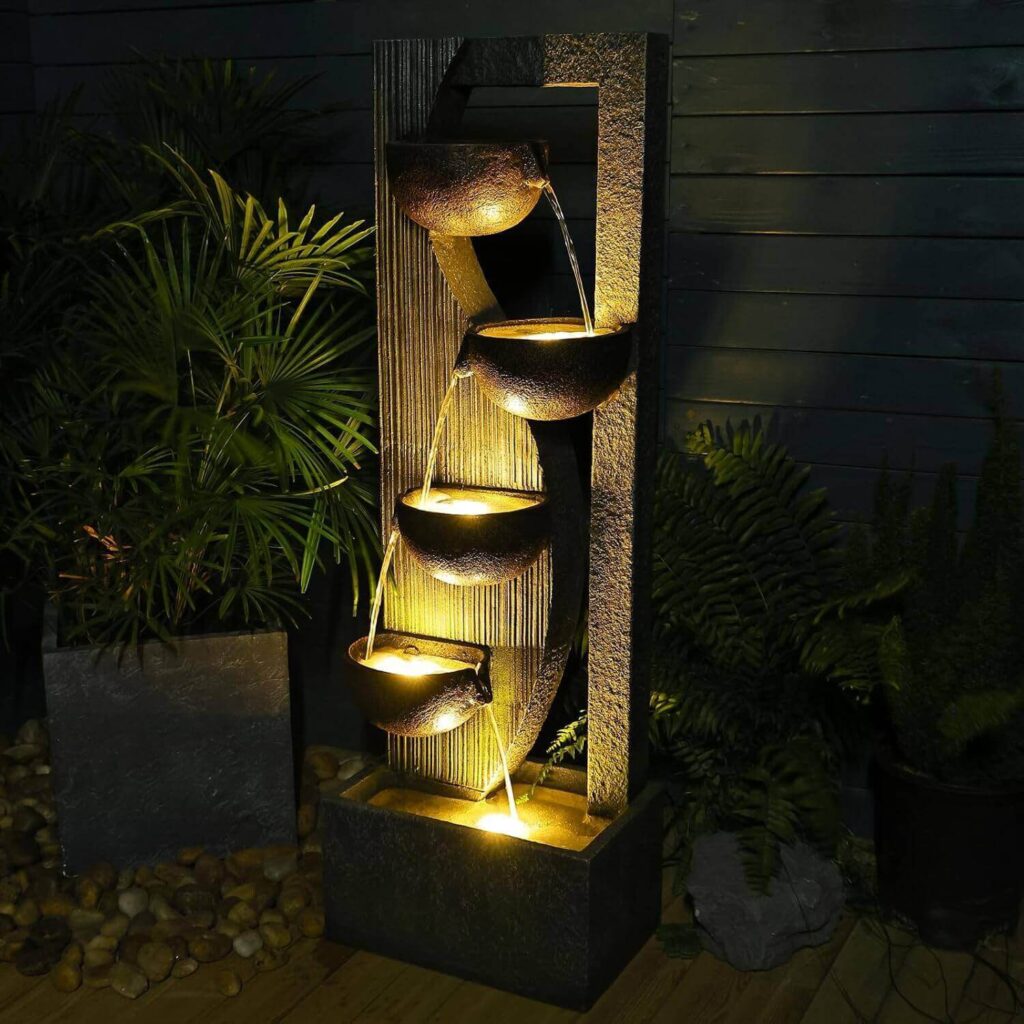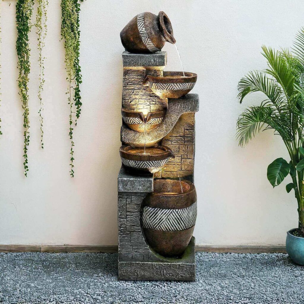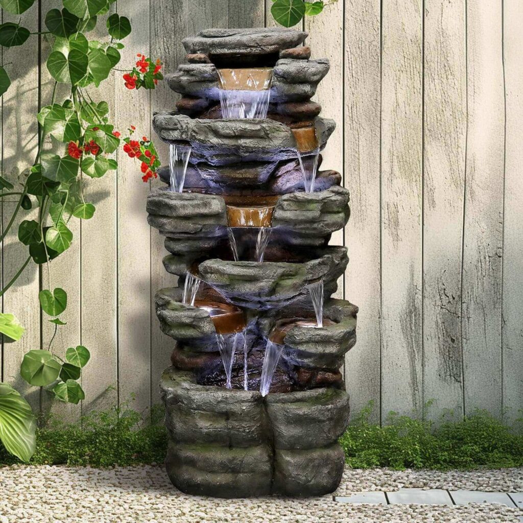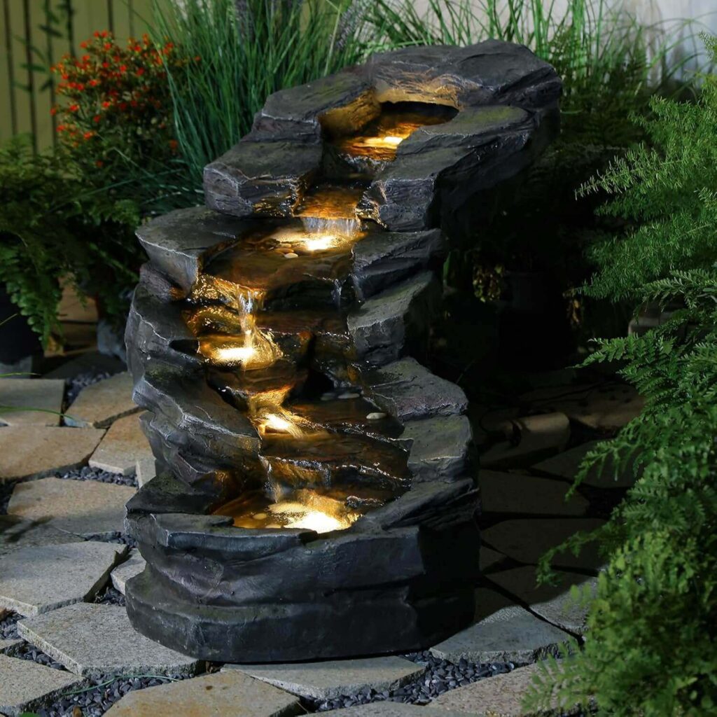 This 5-tier resin and fiberglass fountain offers a natural stone look, soft LED lighting, and a compact size that fits beautifully in entrances, living rooms, offices, patios, or gardens. Customers love how easy it is to install, noting that it functions smoothly, looks stunning, and creates a relaxing water sound perfect for both indoor and outdoor settings. Many appreciate its minimal pump noise, adjustable water flow, and warm lighting, with some adding small touches like pebbles or a switched power strip for convenience. With its stylish design, soothing ambiance, and lightweight durability, it’s praised as a beautiful and enjoyable addition to any space.