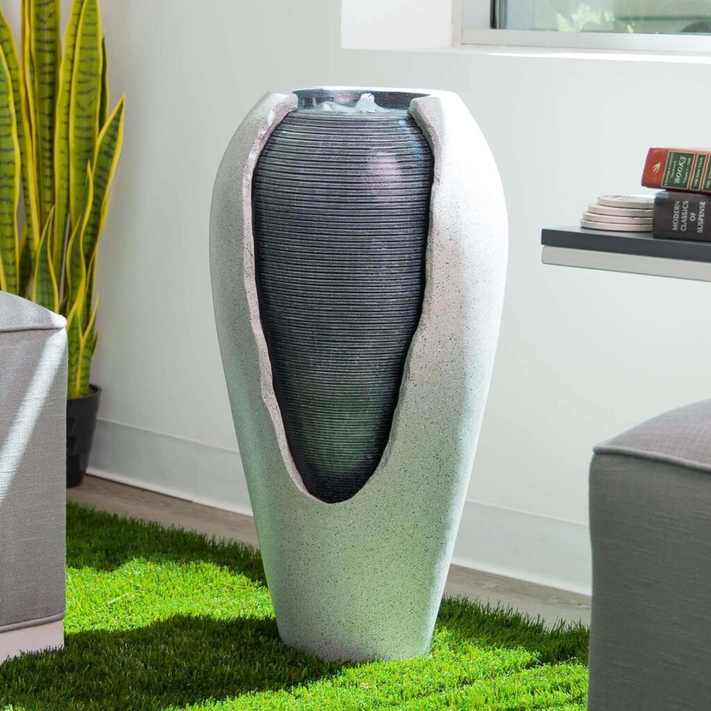 This two-tone ribbed jar fountain offers a modern, elegant look for both indoor and outdoor spaces, enhanced by cool white LED lights for a calming evening glow. Customers praise its soothing water sound, simple setup, and beautiful, high-end appearance, though the pump compartment can feel a bit tight. The fountain runs cleanly with no noticeable splashing and needs only occasional water top-ups. With sturdy packaging and excellent support from Alpine, it becomes a relaxing and reliable focal point for any patio, garden, or living area.